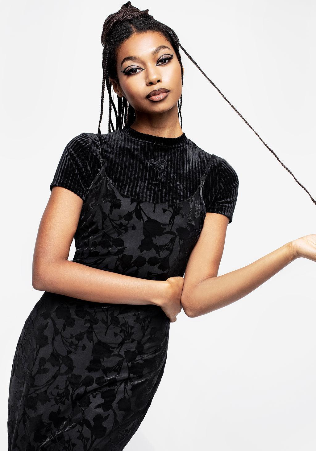 - Black floral flocked print mesh midi dress- Body-conscious fit falls to a midi length- Black mesh fabrication with a delicate floral all-over devoré velvet design (lined for your modesty)- Adjustable cami straps & soft, rounded neckline- Life is bitter enough without denying yourself... *this dress*