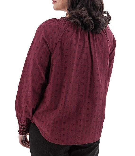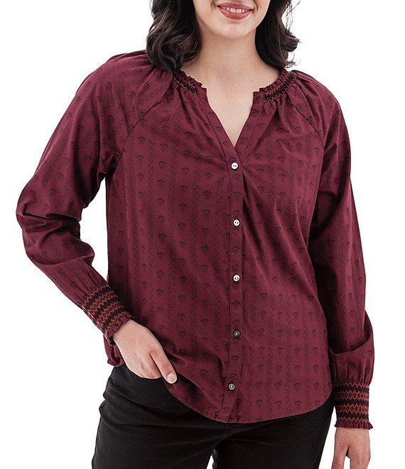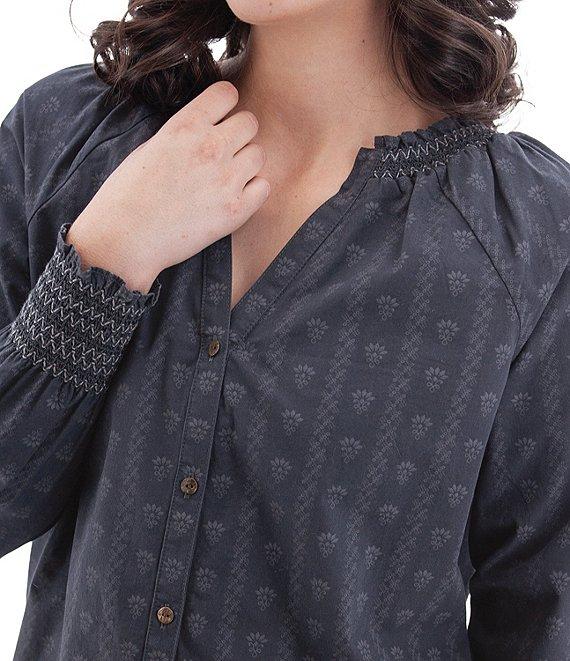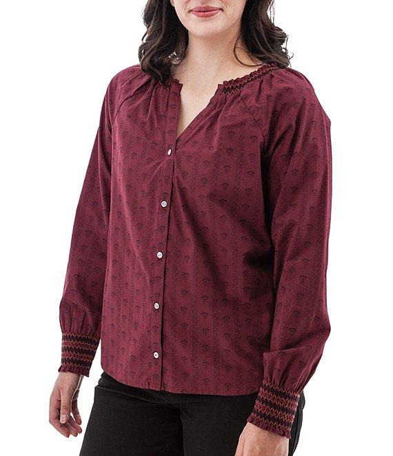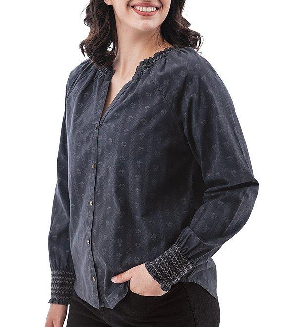 From Aventura, this top features: Woven fabrication Blouse silhouette Split v-neckline Long sleeves with smocked cuffs Ruffle trim at neckline Loose fit Shirttail hemline Button front closure Approx. 25.5" length Organic cotton/lawn woven Machine wash Imported.