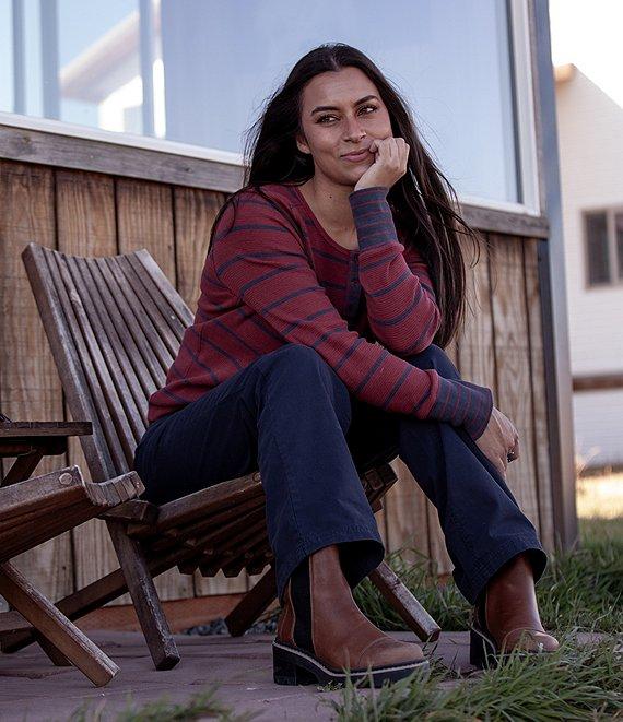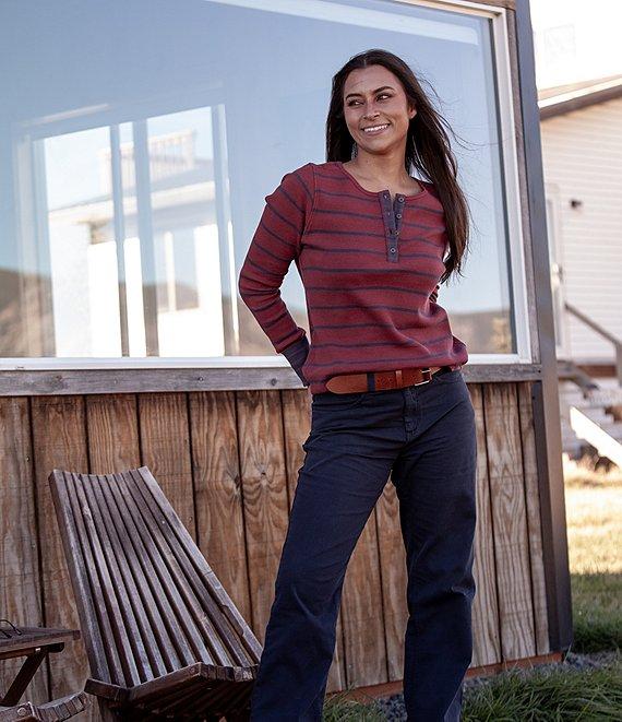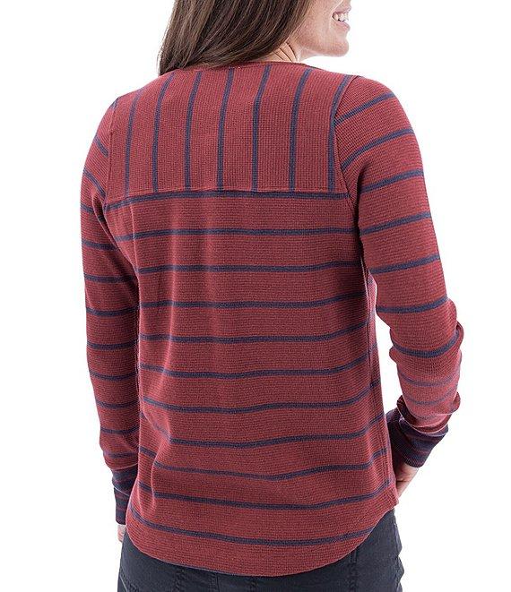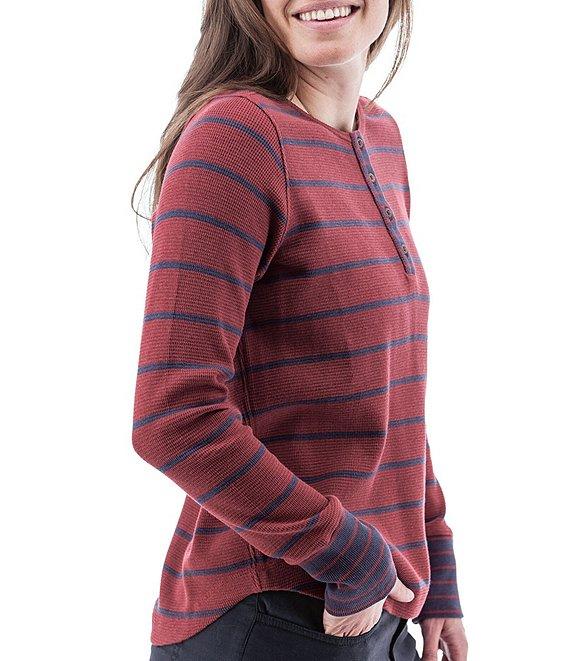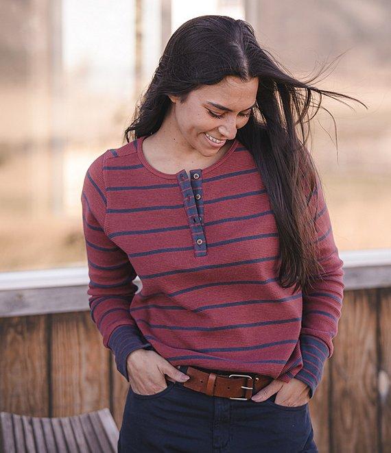 From Aventura, this top features: Rib knit fabrication Crew neckline Long sleeves Striped print Partial front button closure Approx. 25" length Cotton/tencel Machine wash/tumble dry Imported.
