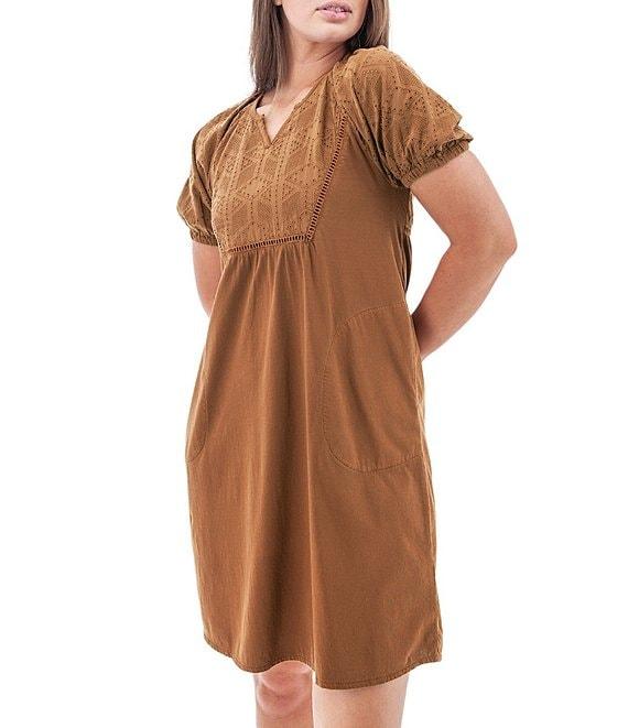 From Aventura, this dress features: Woven eyelet fabrication Shift silhouette V-notch neckline  Short bubble sleeves with elastic cuffs Side seam pockets Schiffli embroidered detail Relaxed fit  Fully lined Straight hemline  Pullover construction Approx. 37" length Recycled cotton jersey/organic cotton Machine wash Imported.