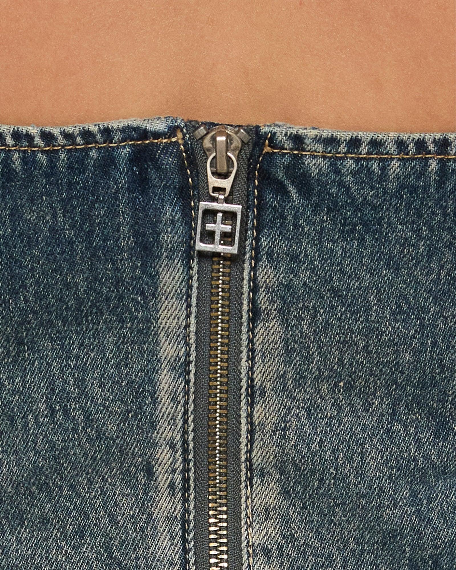 The Avenue Dress in Sandstorm is a fitted, panelled strapless bustier mini dress with an exposed centre back zipper. Made from premium rigid denim in indigo blue wash with a warm tint and sanding, it features light distressing on seams and hem, anti-silver branded zips along the side seams, and dual T-box embroidery branding, making it perfect to wear alone or layered with the Soho Slouch Sandstorm for an elevated chic look.