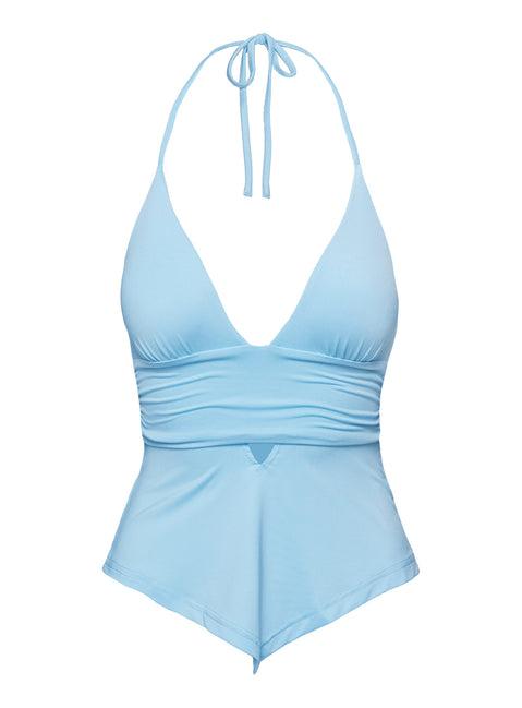 V-neckline, gathered ruched bust, folded-over detail, cut-out at front, adjustable halter straps, partially low back detail
