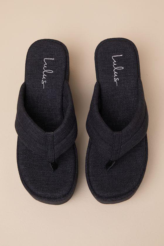 Picture-perfect sunny days always include the Lulus Averell Black Woven Platform Thong Sandals! These effortlessly iconic sandals have a woven fabrication that forms an almond-shaped footbed with a classic thong upper composed of wide, quilted straps. The simple slide-on design sits atop a chunky toe platform and a wedge-like heel.