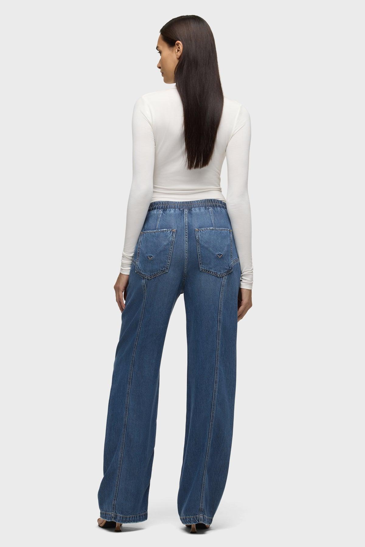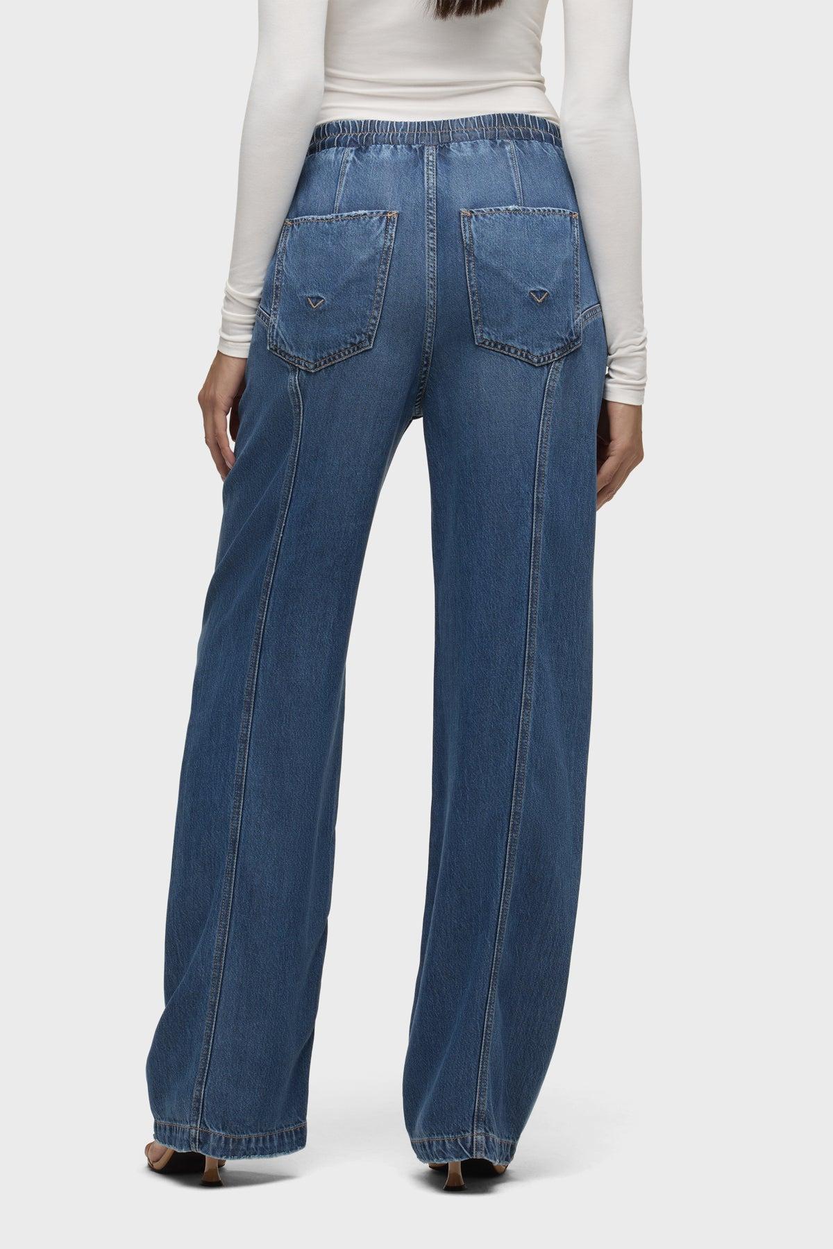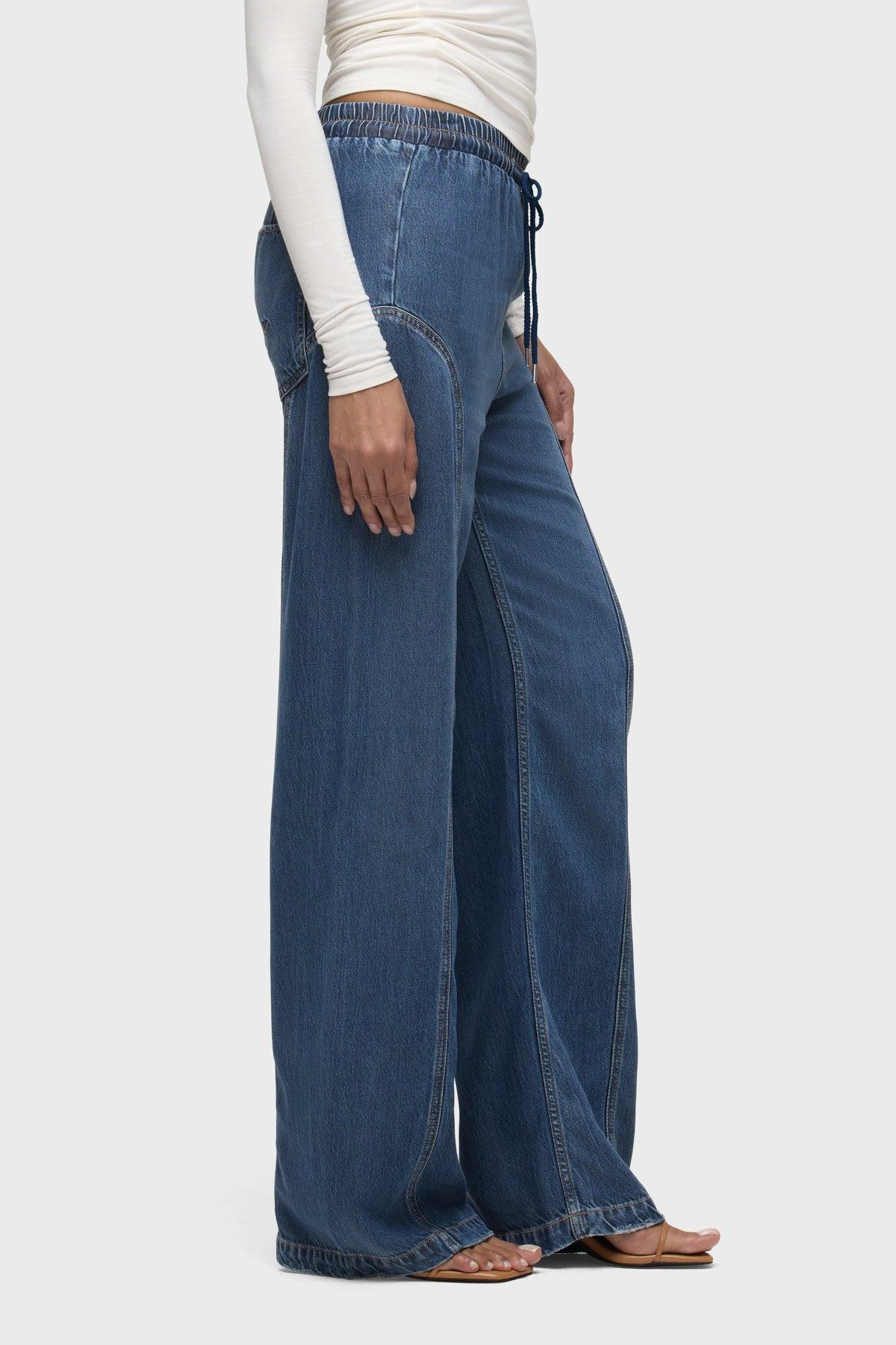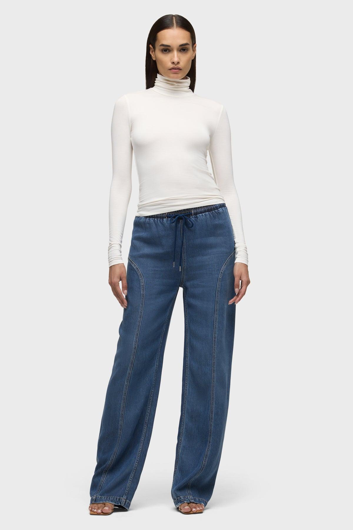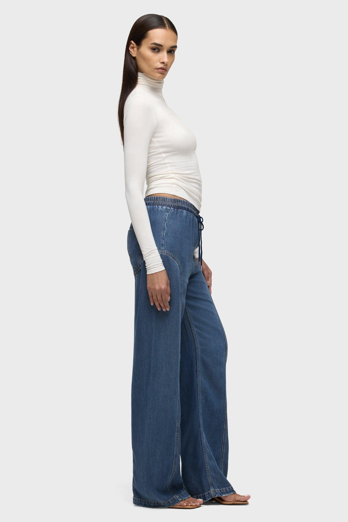 Description The Aviator Drawstring Pant in Ava is the perfect laid-back style for everyday wear. This pant features a comfortable drawstring waist and seaming details at the side seam. It is made of a lightweight rigid denim fabric in a medium-dark indigo wash. Product Details Rise: 10.5", Inseam: 31", Leg Opening: 20.625" Fit & Care Content: 100% Tencel Machine wash cold gentle cycle Only non-chlorine bleach when needed Tumble dry low Medium iron if needed