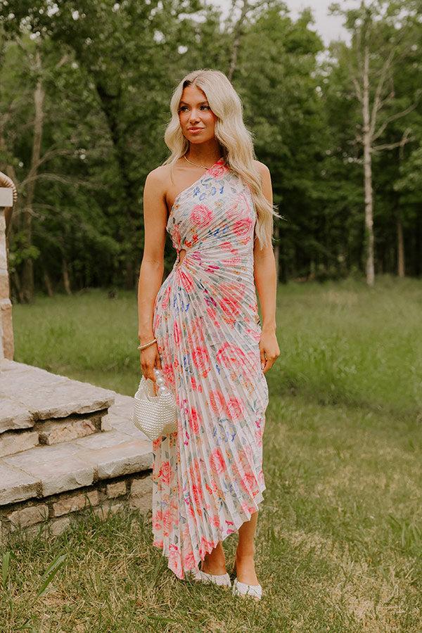 - Charm your way through any event in this pleated satin maxi dress. Featuring a floral print, a flirty cutout, and an asymmetrical neckline, it's a stunning piece made for anytime you want to feel extra fabulous.