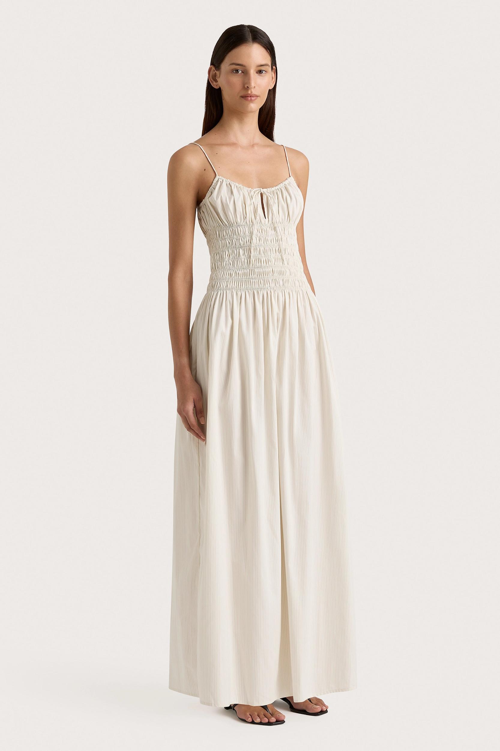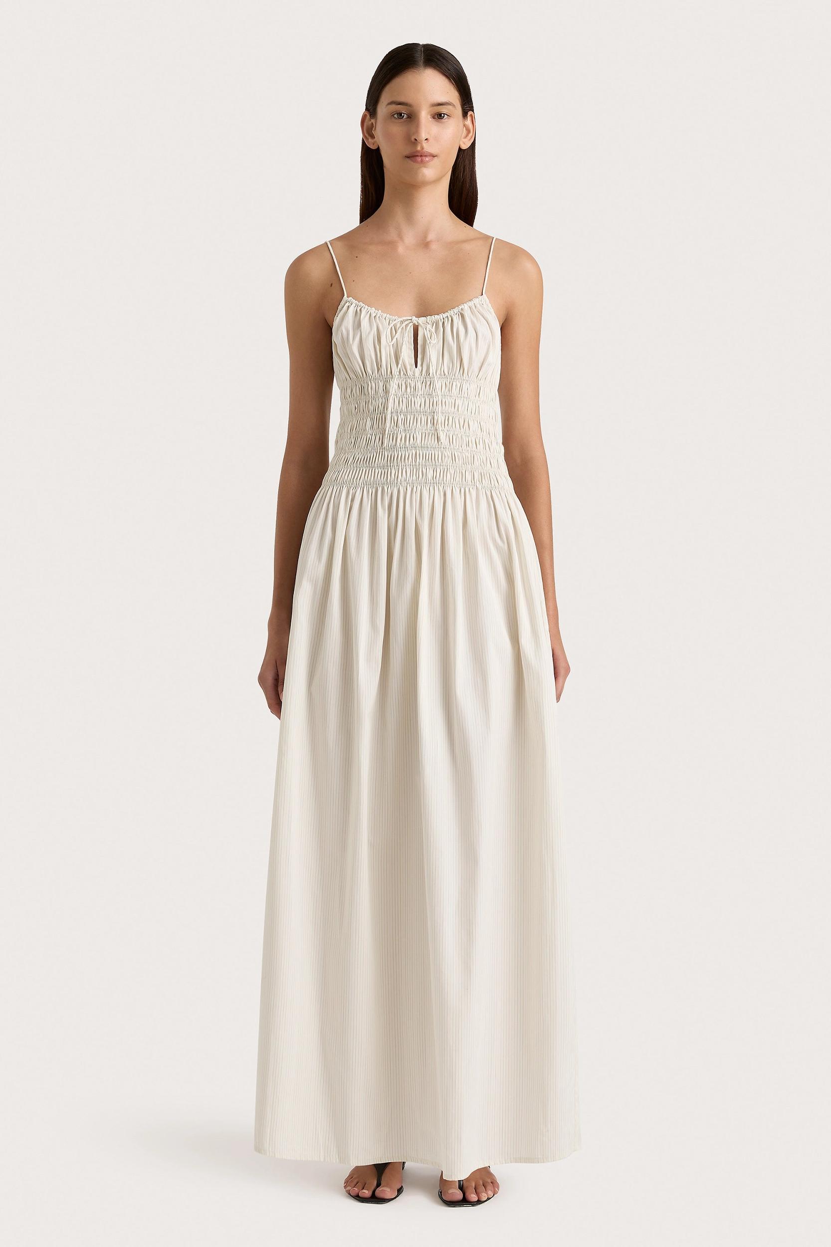 A lightweight maxi dress with a feminine silhouette and soft floating A-line skirt. It features thin delicate straps with a front tie detail that leads into a shirred bodice and channelled elastic waist. Offering significant stretch and movement, it is cut from a yarn-dyed cream pinstripe organic cotton. Style with a simple sandal for everyday vacation wear.