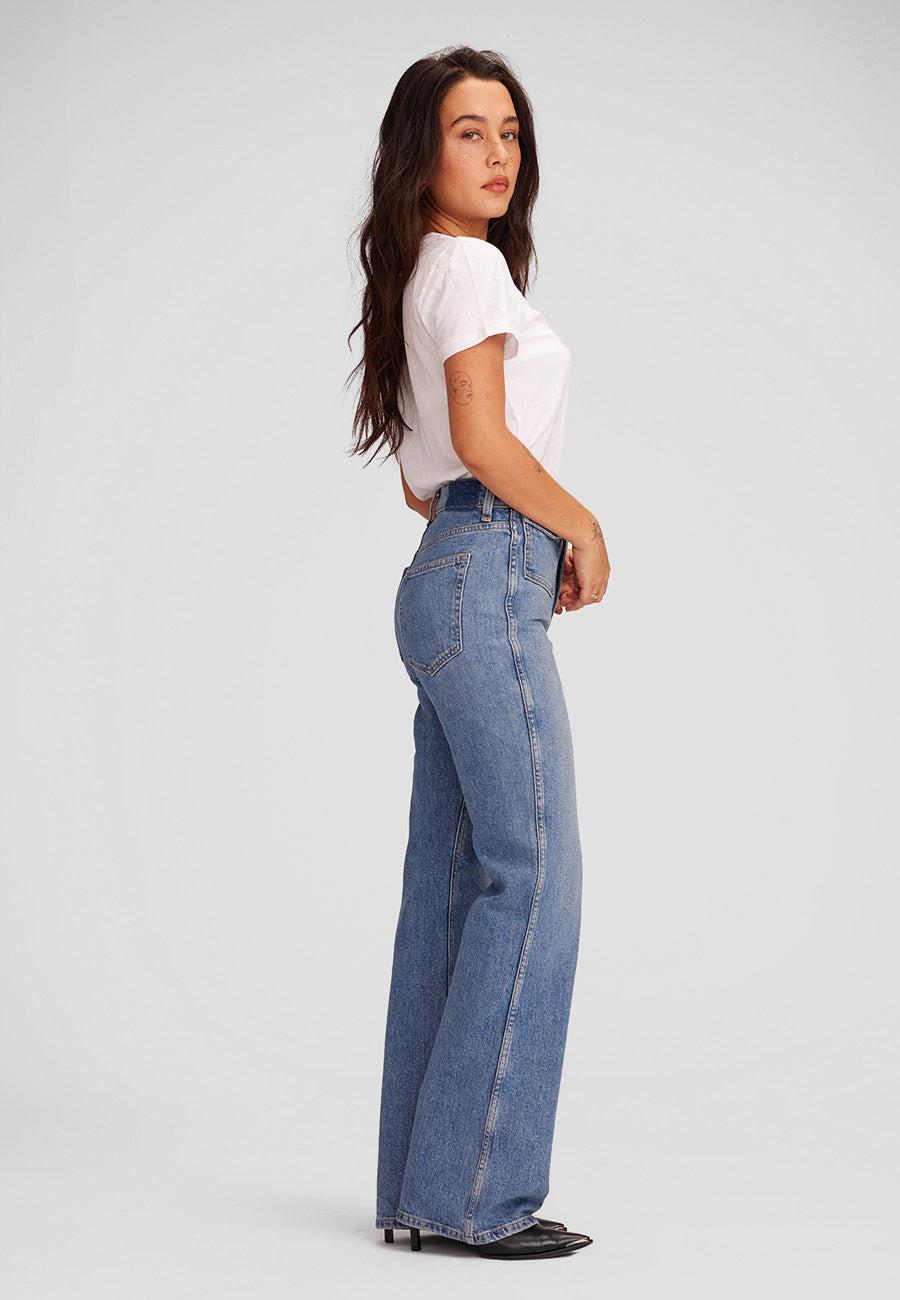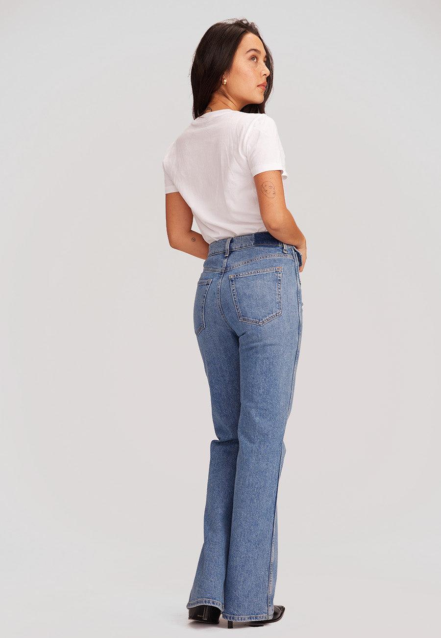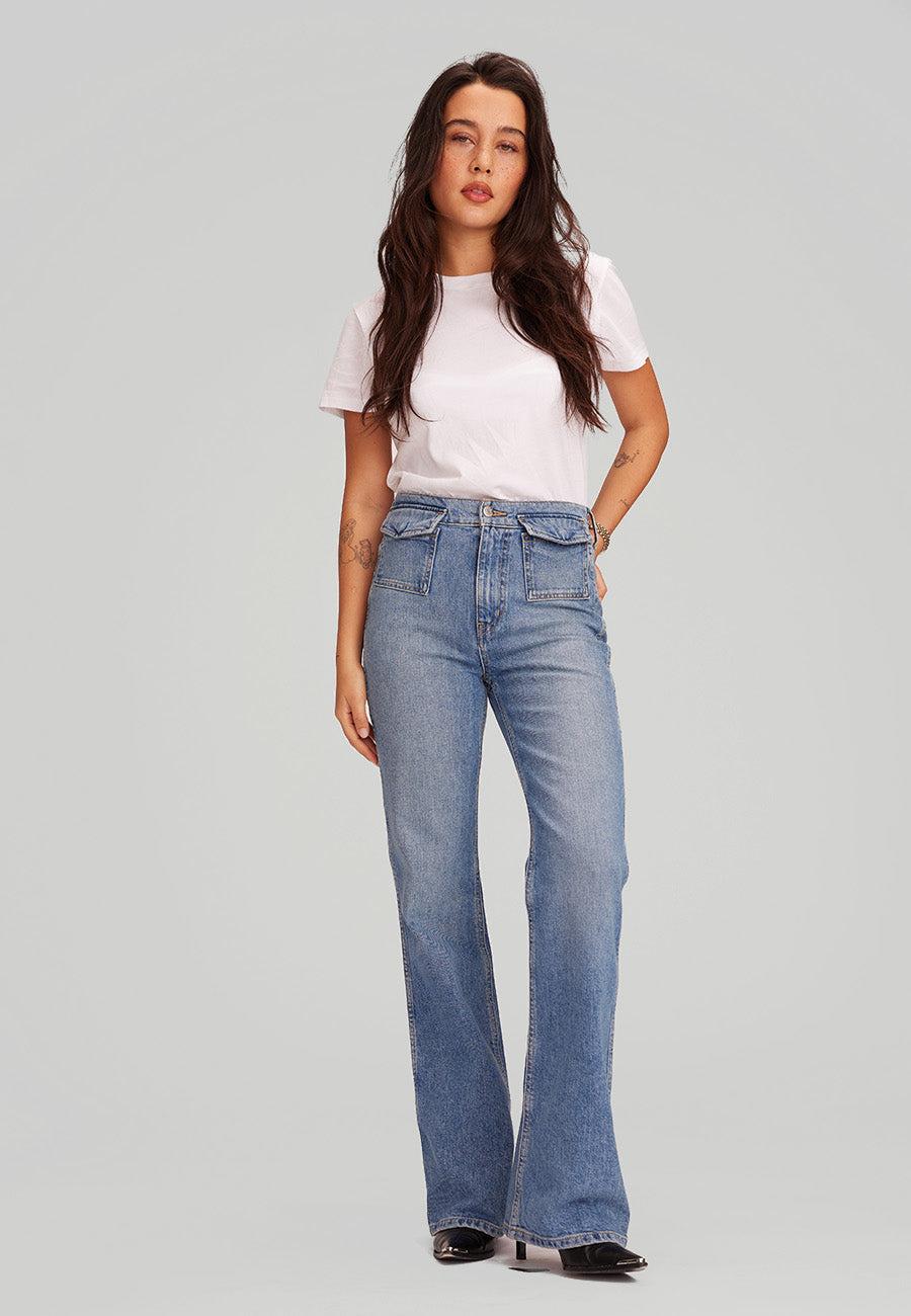 Ayla sits high on the waist and slim through the hips with a modern, sleek boot leg breaking at the mid thigh for a leg lengthening effect.70’s patch pockets add a bohemian touch.