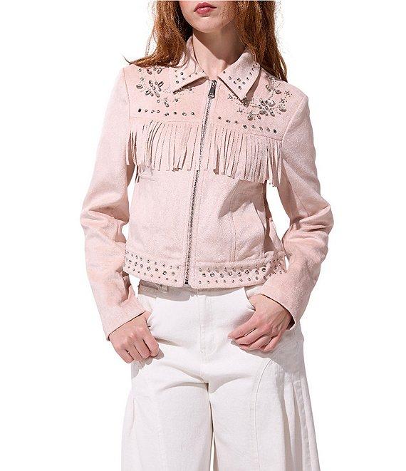 From Azalea Wang, this jacket features: Soft blush fabrication Denim jean silhouette Point collar neckline Long sleeves Side seam pockets Fringe detail Studded trim Fitted fit Lined Straight hemline Zip front closure Approx. 20" length Polyester Dry clean Imported.