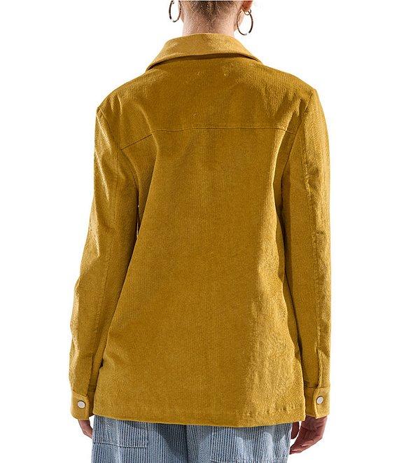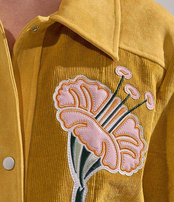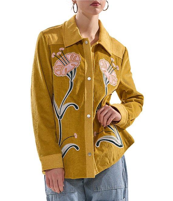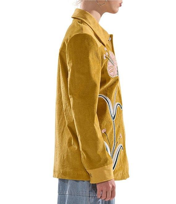 From Azalea Wang, this jacket features: Corduroy fabrication Field jacket silhouette Floral pattern Point collar neckline Long sleeves with button cuffs Two side pockets Embroidered detail Light weight Relaxed fit Lined Straight hemline Snap front closure Polyester Dry clean Imported.