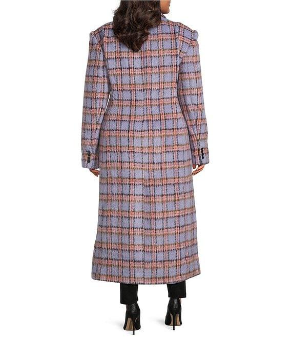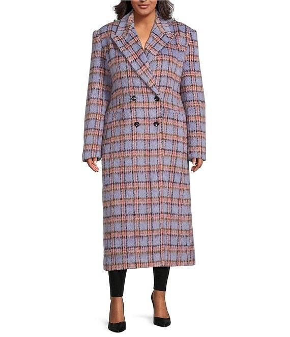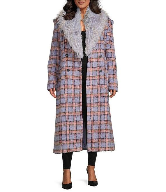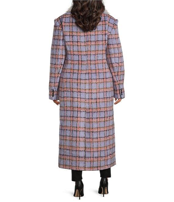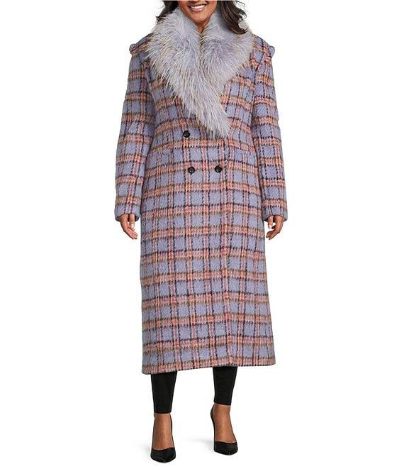 From Azalea Wang Plus, this coat features: Double breasted silhouette Plaid print Faux fur shawl collar neckline Long sleeves Two front pockets Oversize faux fur collar removable with buttons Tailored fit Fully lined Straight hemline Button front closure Approx. 46" length Polyester Dry clean Imported.