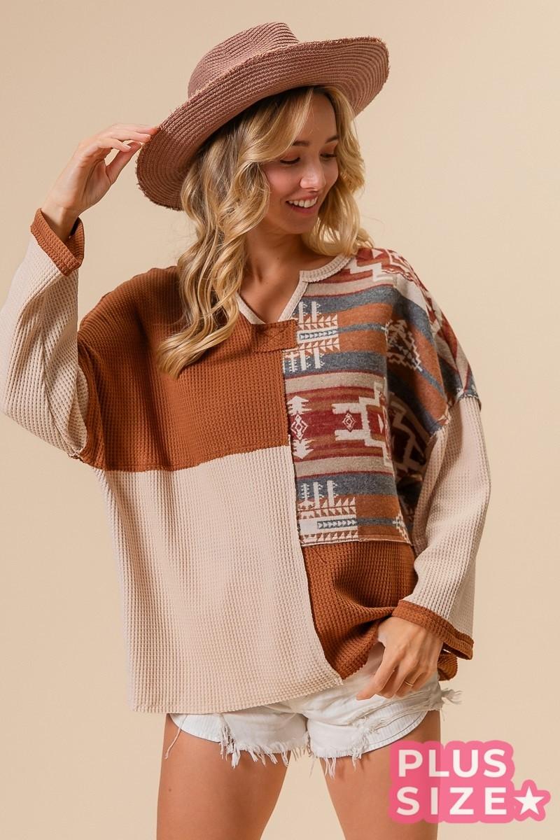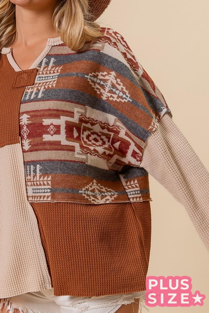 PLUS SIZE COLORBLOCK AND AZTEC MIX AND MATCH TOP Model wearing a small