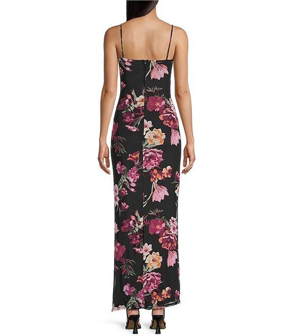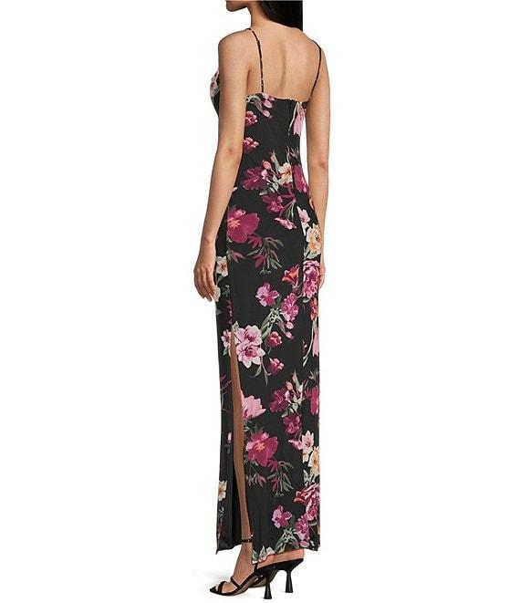 B. Darlin Floral Print Mesh Cowl Neck Side Slit Maxi Dress