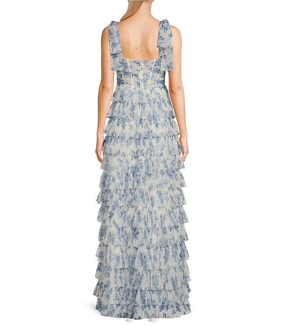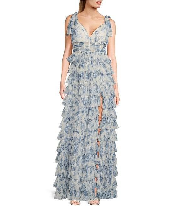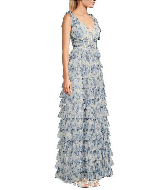 B. Darlin Floral Print V-Neck Tie Straps Tiered Ruffle A-Line Dress