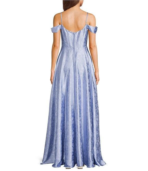 From B. Darlin, this dress features: Floral jacquard fabricationSweetheart off-the-shoulder neck Adjustable spaghetti strapsPocketsZip back closureLinedBustier bodice corsetApprox. 64" HPS front slitPolyester/spandexHand washImported.