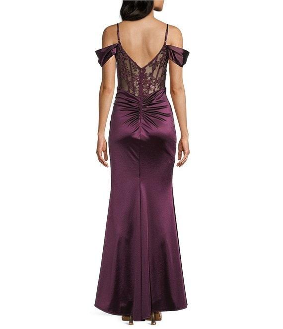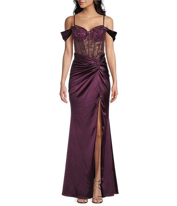 From B. Darlin, this dress features: Sweetheart neckline Off the shoulder Corset bodice Zip back closure Knot front detail HPS 64" length Polyester/spandex Spot clean Imported.