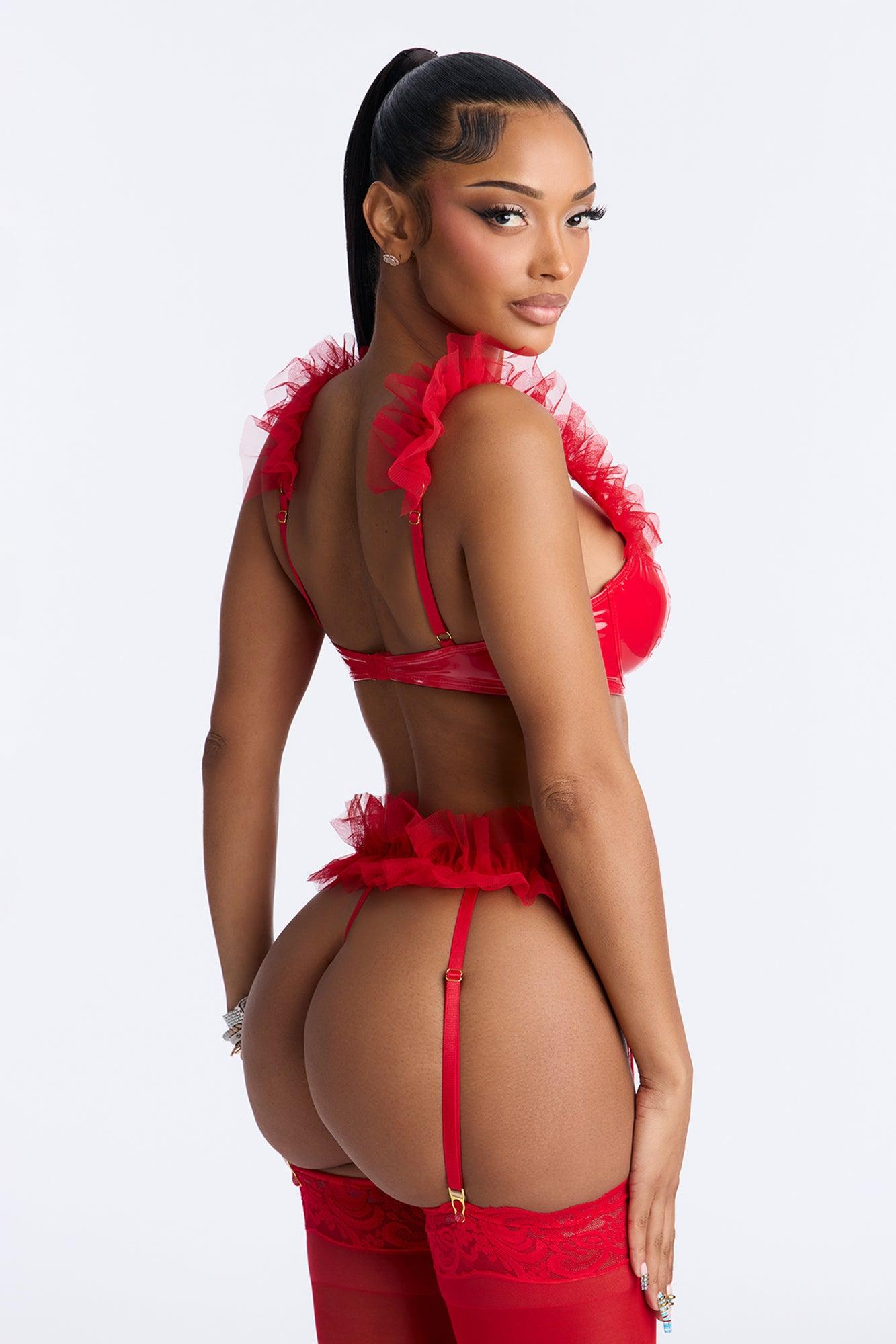 Available In Black And Red. 3 PC Vinyl Set Adjustable Straps Ruffle Trim Underwire Hook And Eye Closure Matching Garter Belt Attached Garter Straps Matching Thong Panty Final Sale Shell : 92% Polyester 8% Spandex Mesh: 88% Nylon 12% Spandex Imported California Proposition 65WARNING: Cancer and Reproductive Harm - www.P65Warnings.ca.gov.
