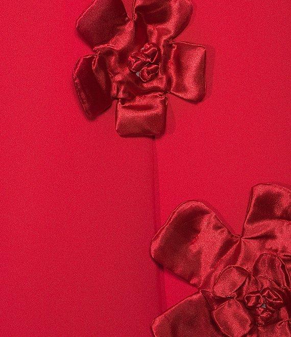 From Belle by Badgley Mischka, this dress features: Stretch crepe fabrication A-line silhouette Round neckline Long sleeves Floral applique detailing Straight hemline Zip back closure Approx. 23.12" sleeve length Polyester/spandex Dry clean Imported.