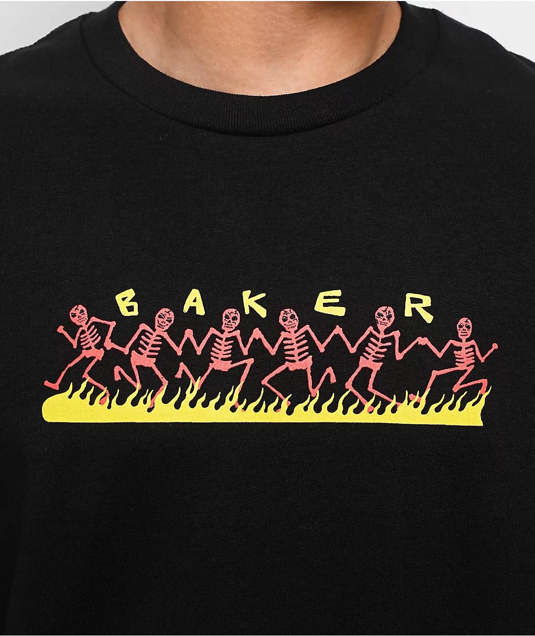 Add an edgy vibe to your outfit with the Dancing Skellies t-shirt from Baker Skateboards in a timeless black colorway. Printed on the front of the graphic tee is an array of red skeletons Dancing in a fire pit adorned with branding. A printed neck la