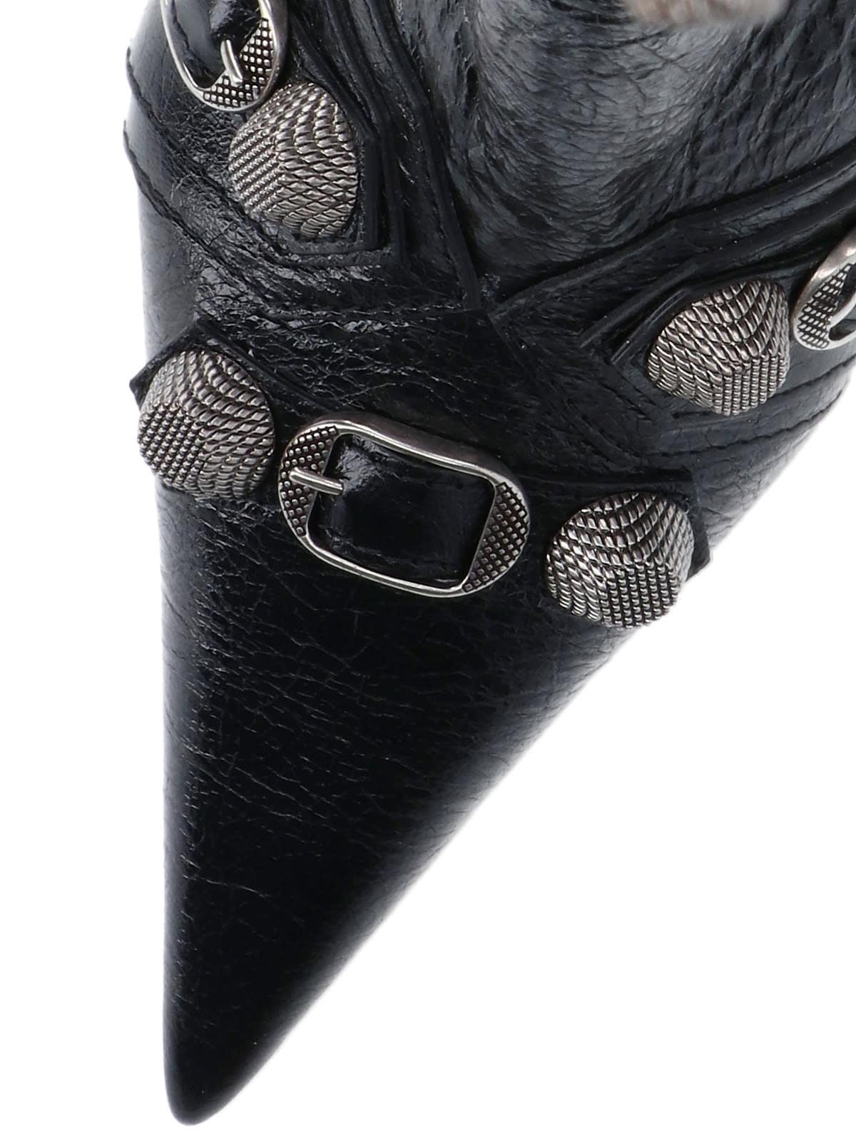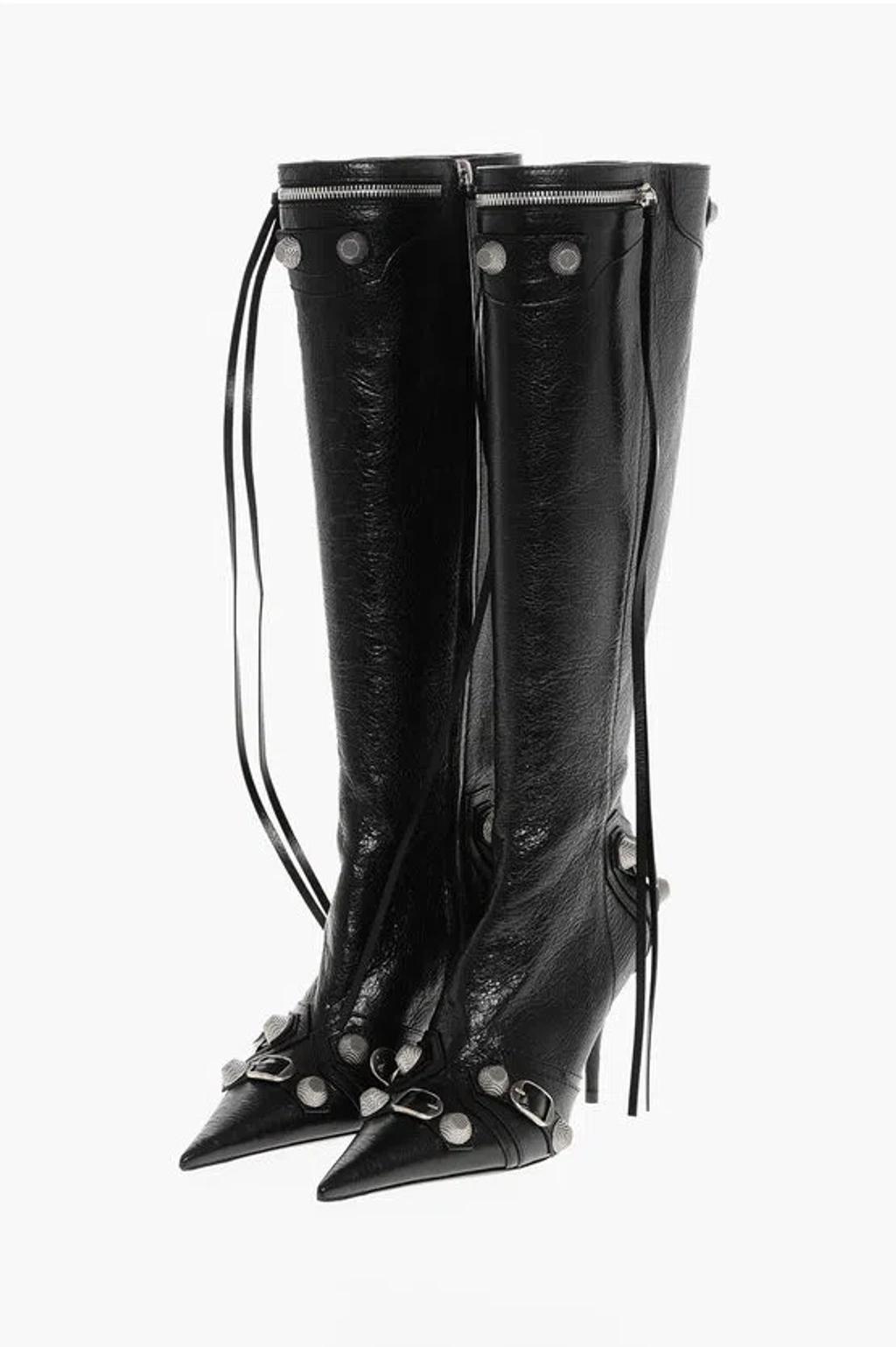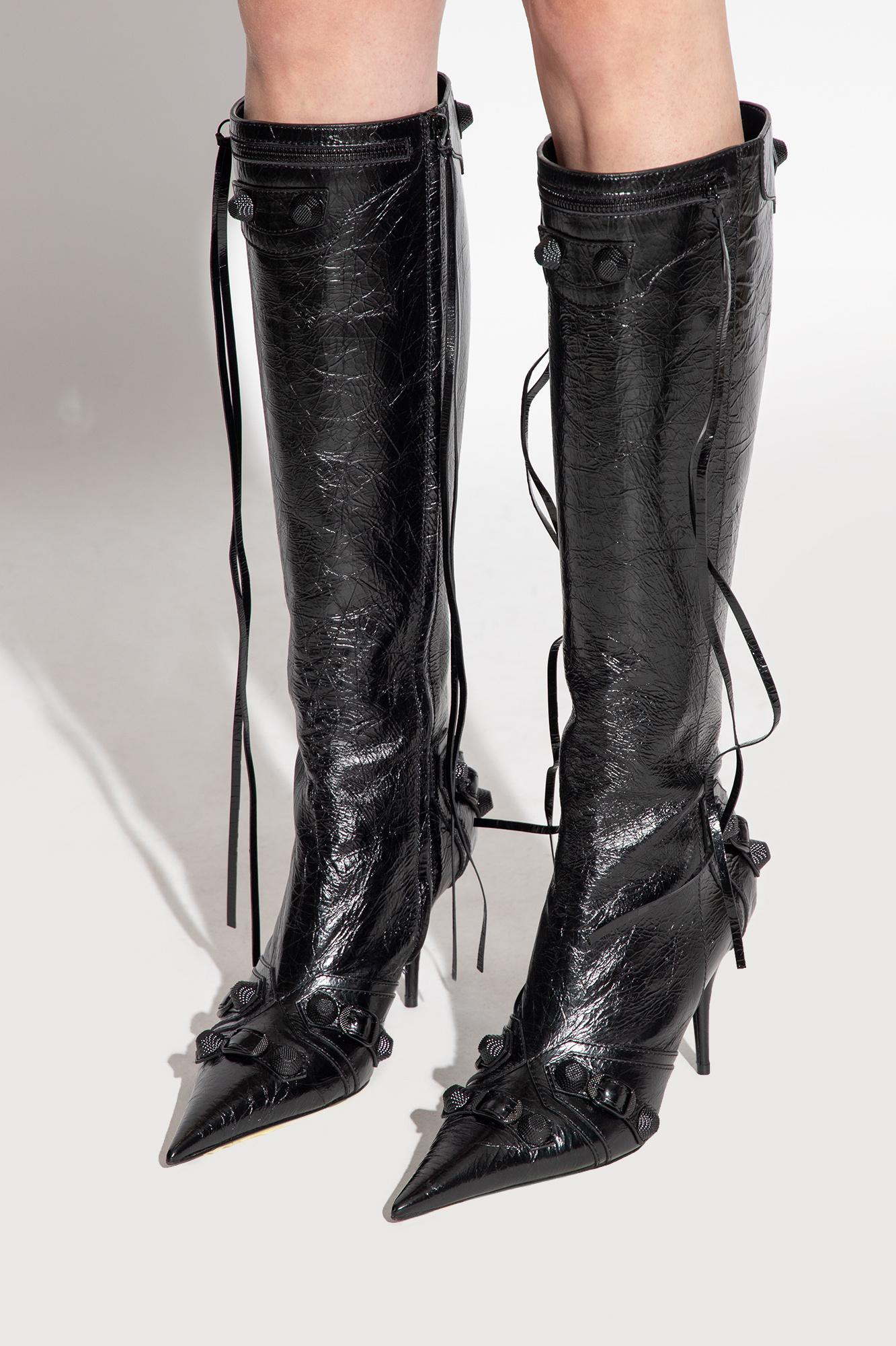 Shop Balenciaga Brushed Leather Cagole Boots With Studs And Zips 10cm In Black from 800+ stores, starting at $811. Balenciaga's 'Cagole' knee boots are embellished with the hardware usually seen on the label's bag of the same name. They're crafted from glossy textured-leather in a sleek point-toe shape and poised on slim stiletto heels. Wear yours with a mini dress for high-octane glamour.