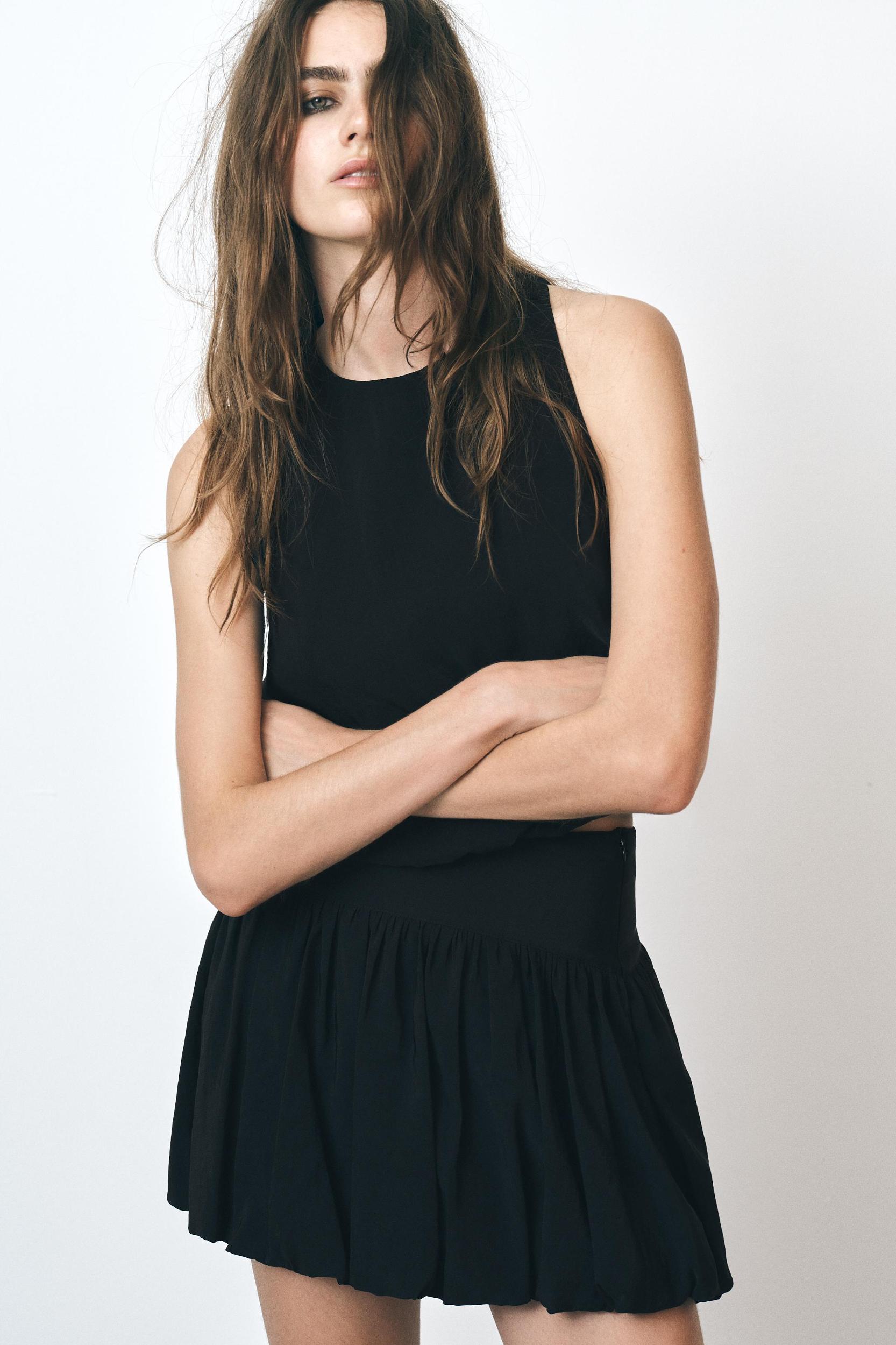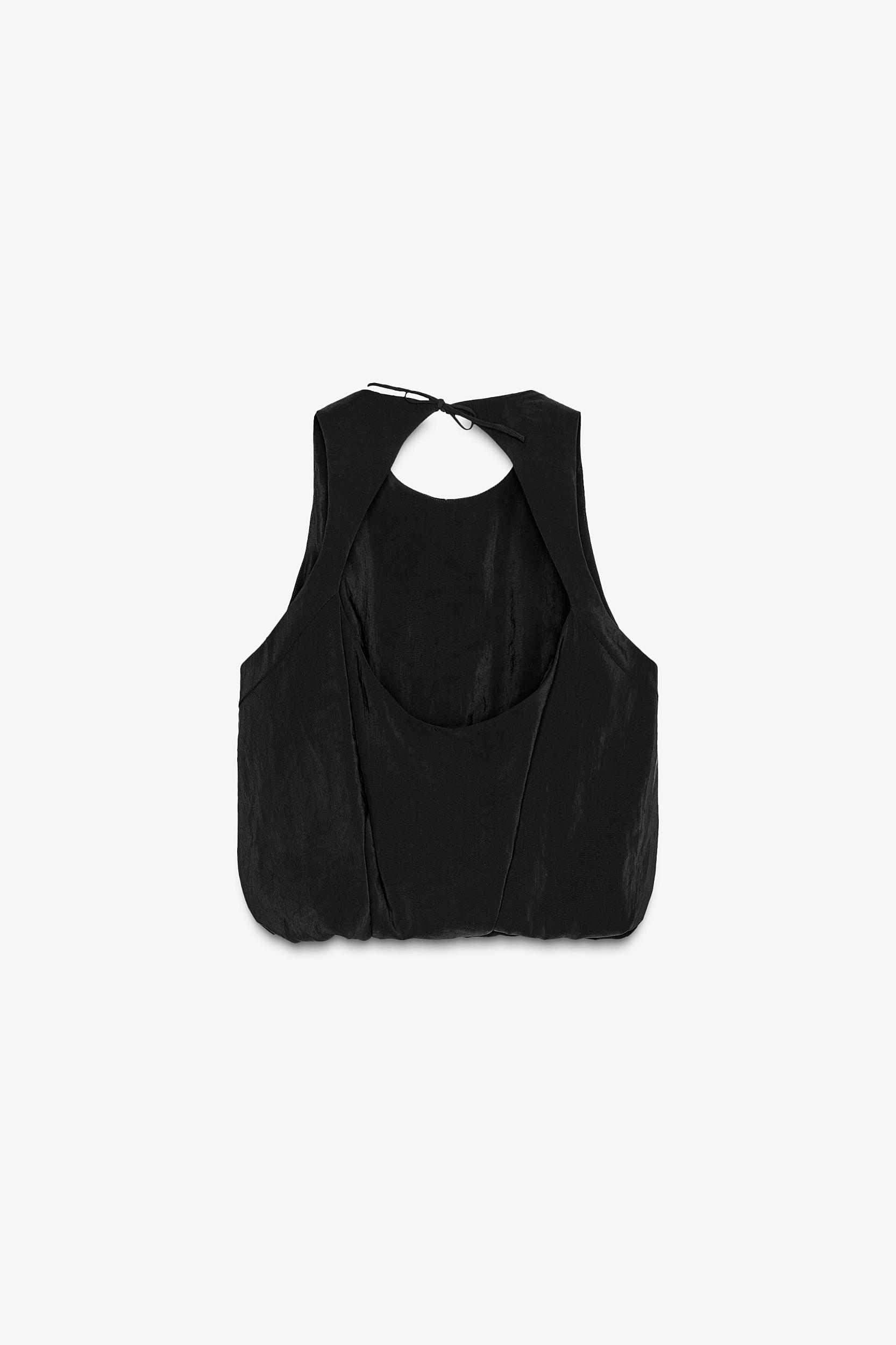 Sleeveless round neck top. Open back detail. Ballon hem with interior elastic. Back tie closure.