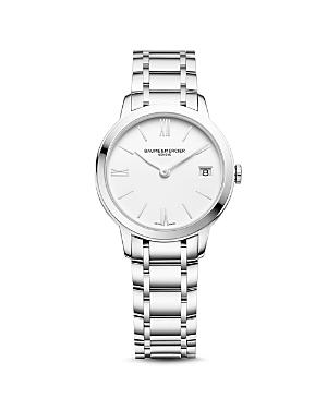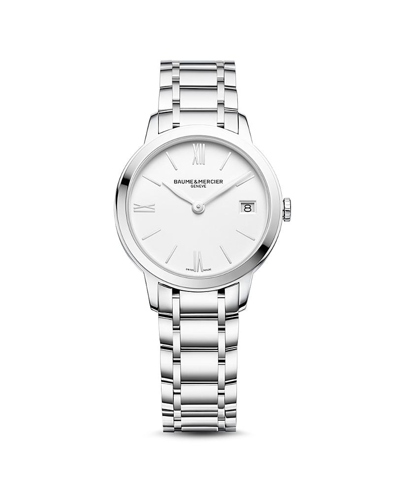 A womens steel watch that balances strength and elegance, the Classima 10335 has a round 31 mm stainless steel case and matching bracelet with a triple folding clasp and security push-pieces. The rhodium-plated hands sweep around the pure white dial, which features classic Roman numerals and a date aperture at 3 oclock. This urban chic steel bracelet watch for her is driven by Swiss made quartz movement.