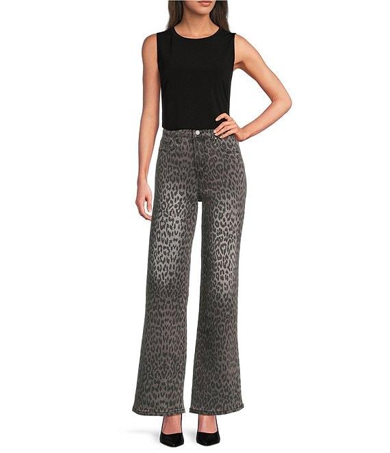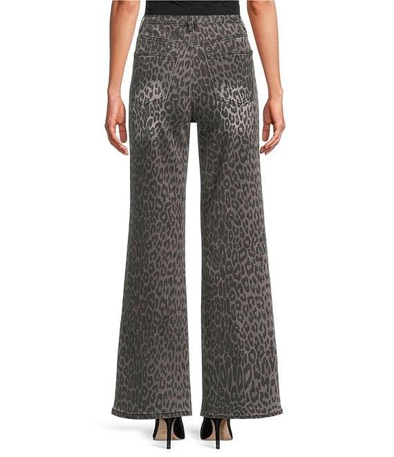 From Bayeas, these jeans feature: Stretch denim fabrication Wide leg silhouette Leopard print High rise Belt loops 5 pocket styling Full length Front button and zipper closure Approx. 32" inseam Cotton/polyester/viscose/spandex Machine wash Imported.