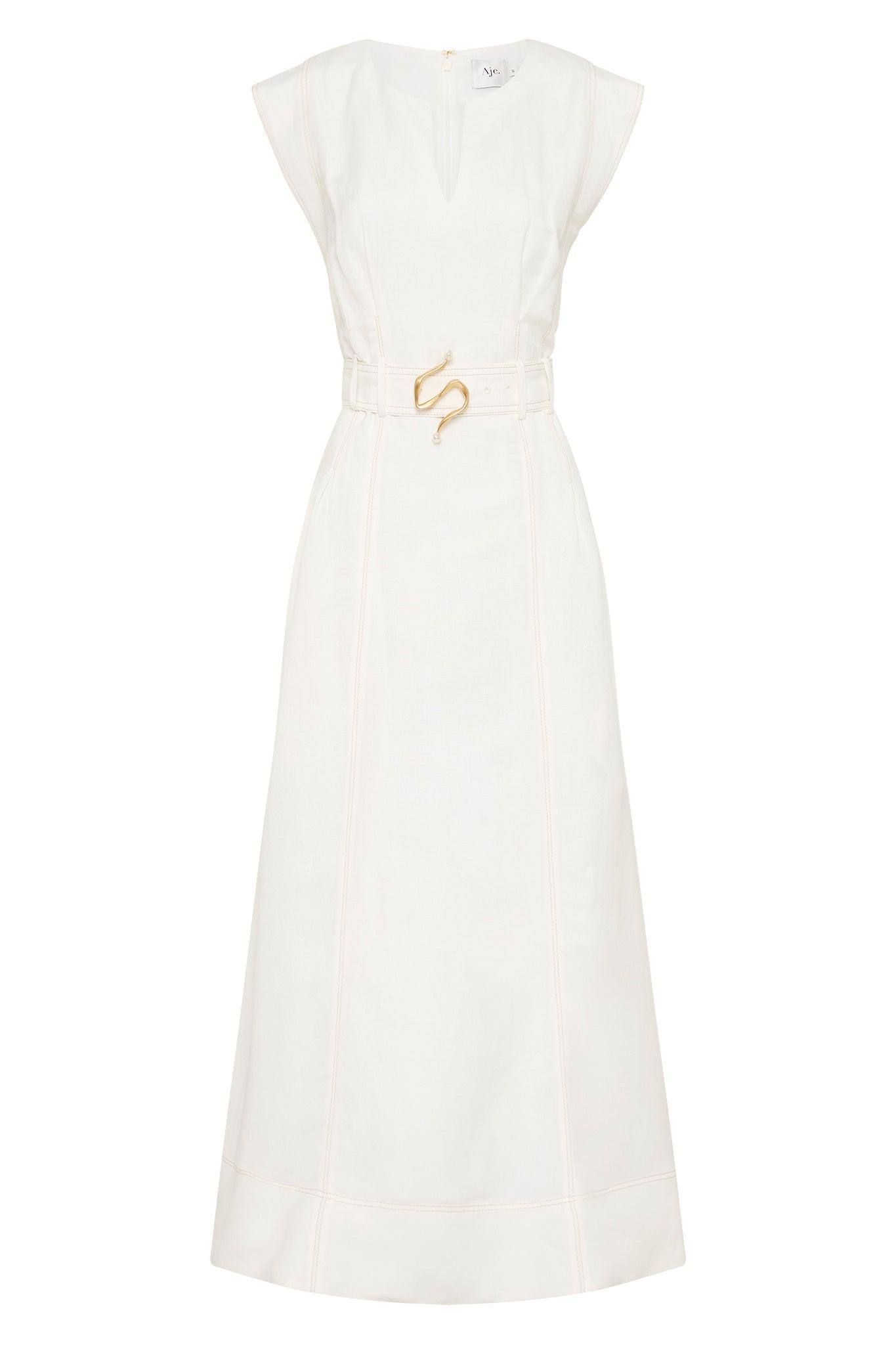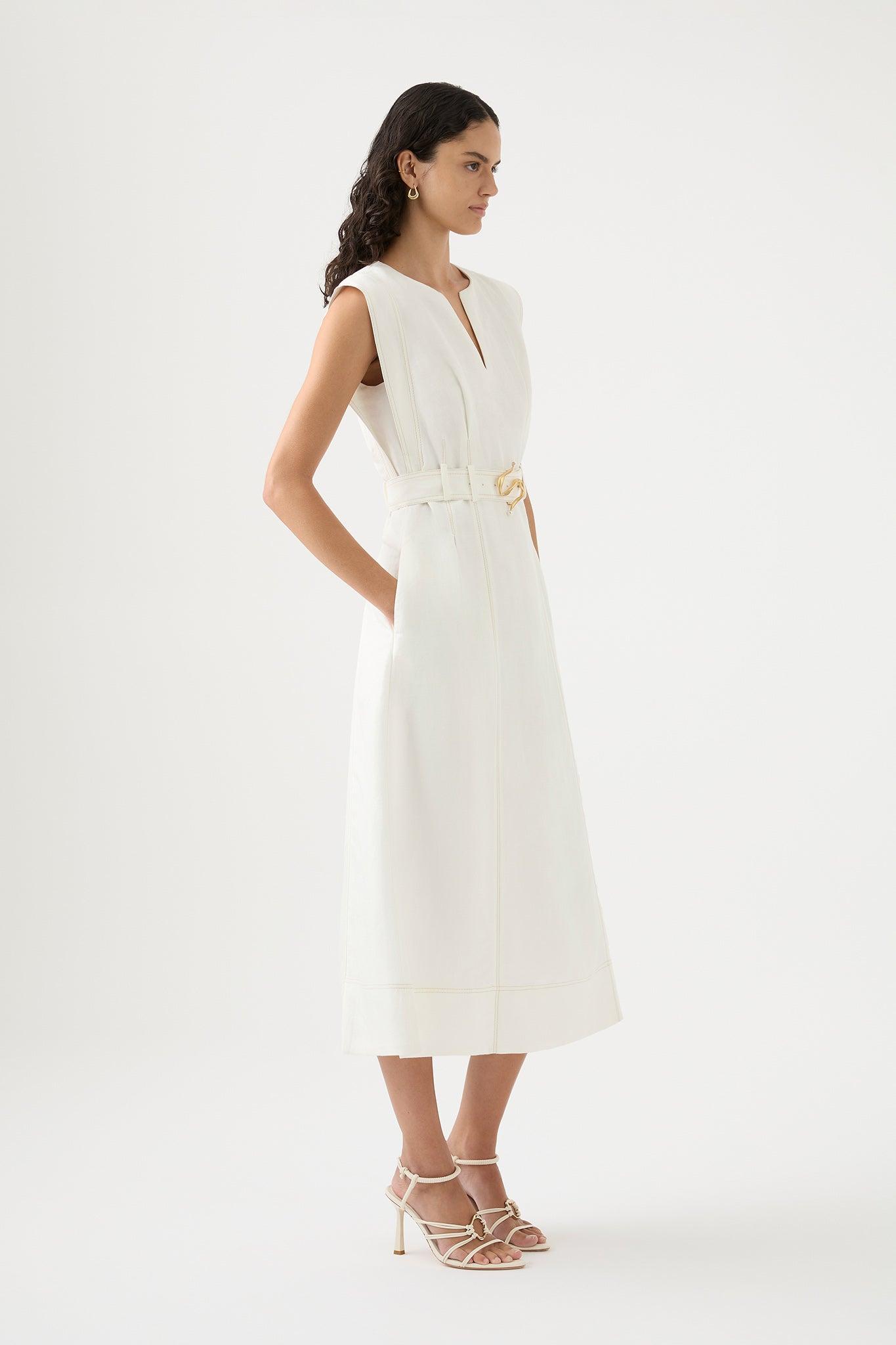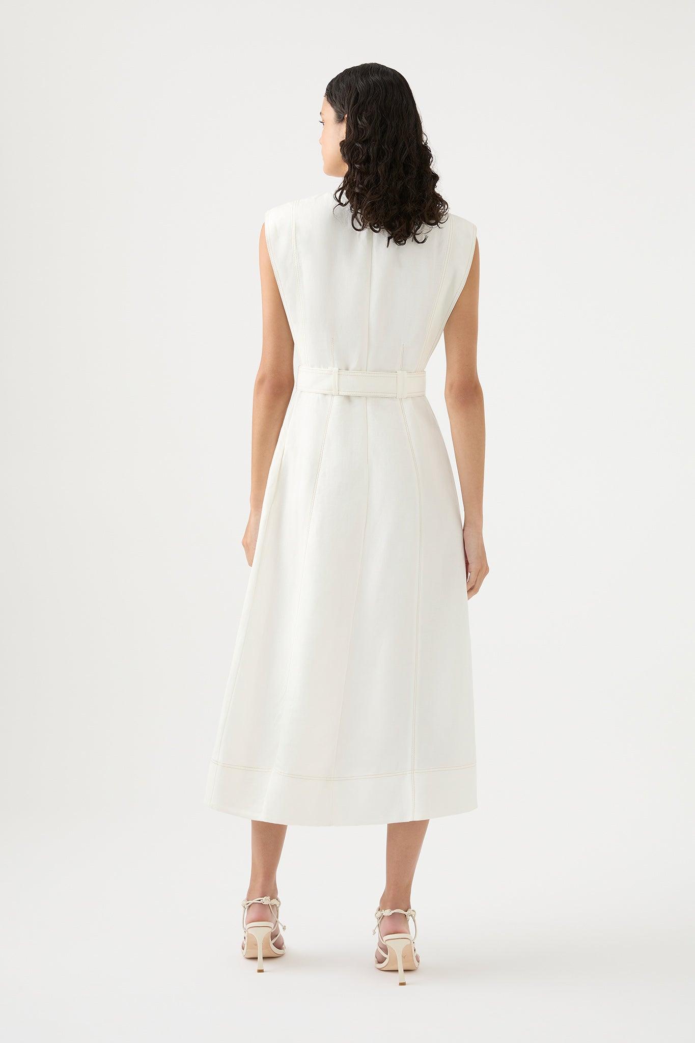 PRODUCT DETAILS Midi dress V-neck Extended shoulders Fit-and-flare shape Lined style Twin belt loops Shop All DressesSIZE AND FIT Model wears a size 8/S Model: 180cm/5’11 Bust: 84cm Waist: 64cm Hips: 91cm FABRICATION Main: 55% Linen 45% Rayon Lining: 100% Cotton Voile Dry Clean Only