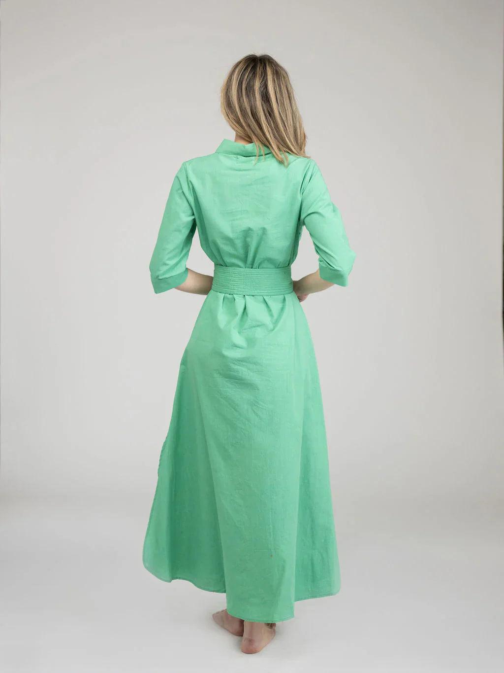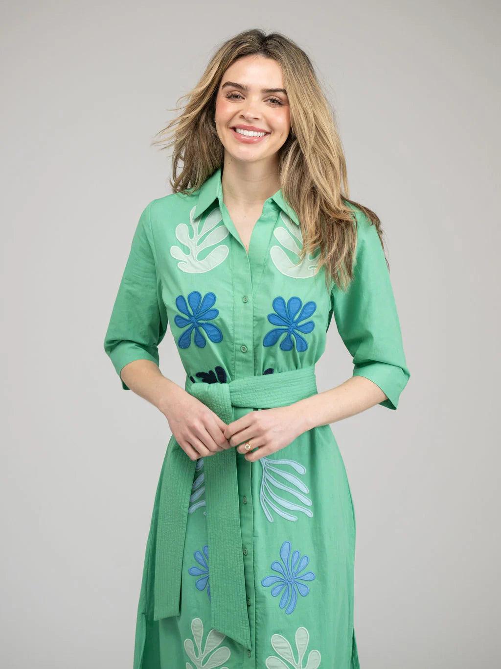 Effortlessly elevate your style with The Eloise Dress. The classic design includes a button up bodice, quarter length sleeves, and an optional tie waist for a timeless silhouette. Featured in our new White Large Leaf Patchwork. Perfect for everyday wear.