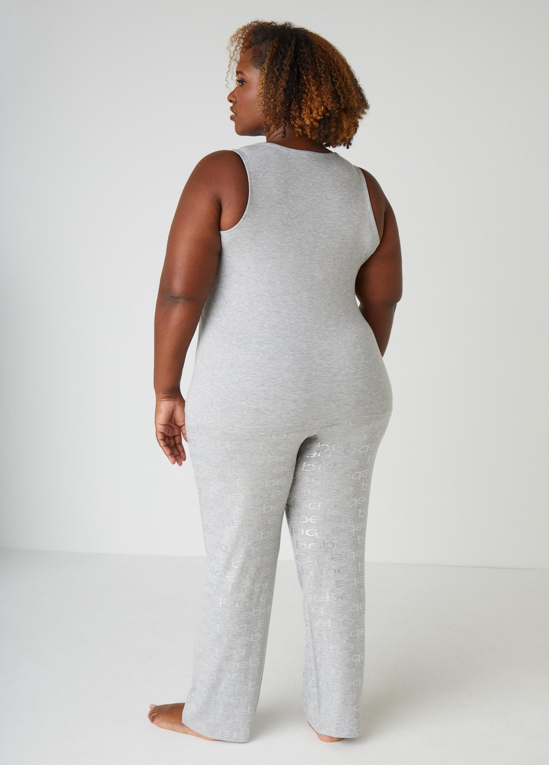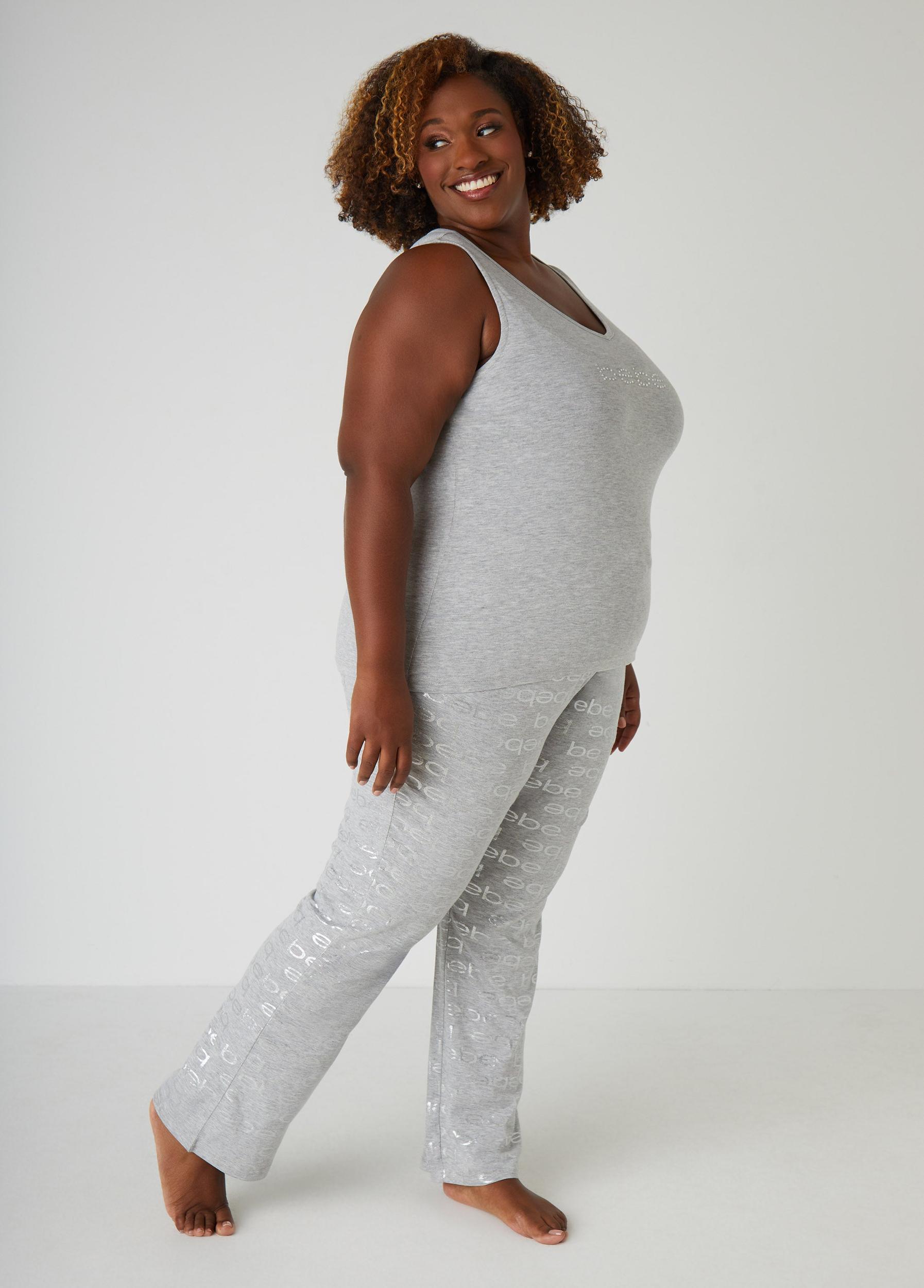 A sea of Bebe's renowned logo cascades down the pants of this pajama set matched with a crystal-dripped camisole that is a little sexy, a little cute and a lot of comfy.