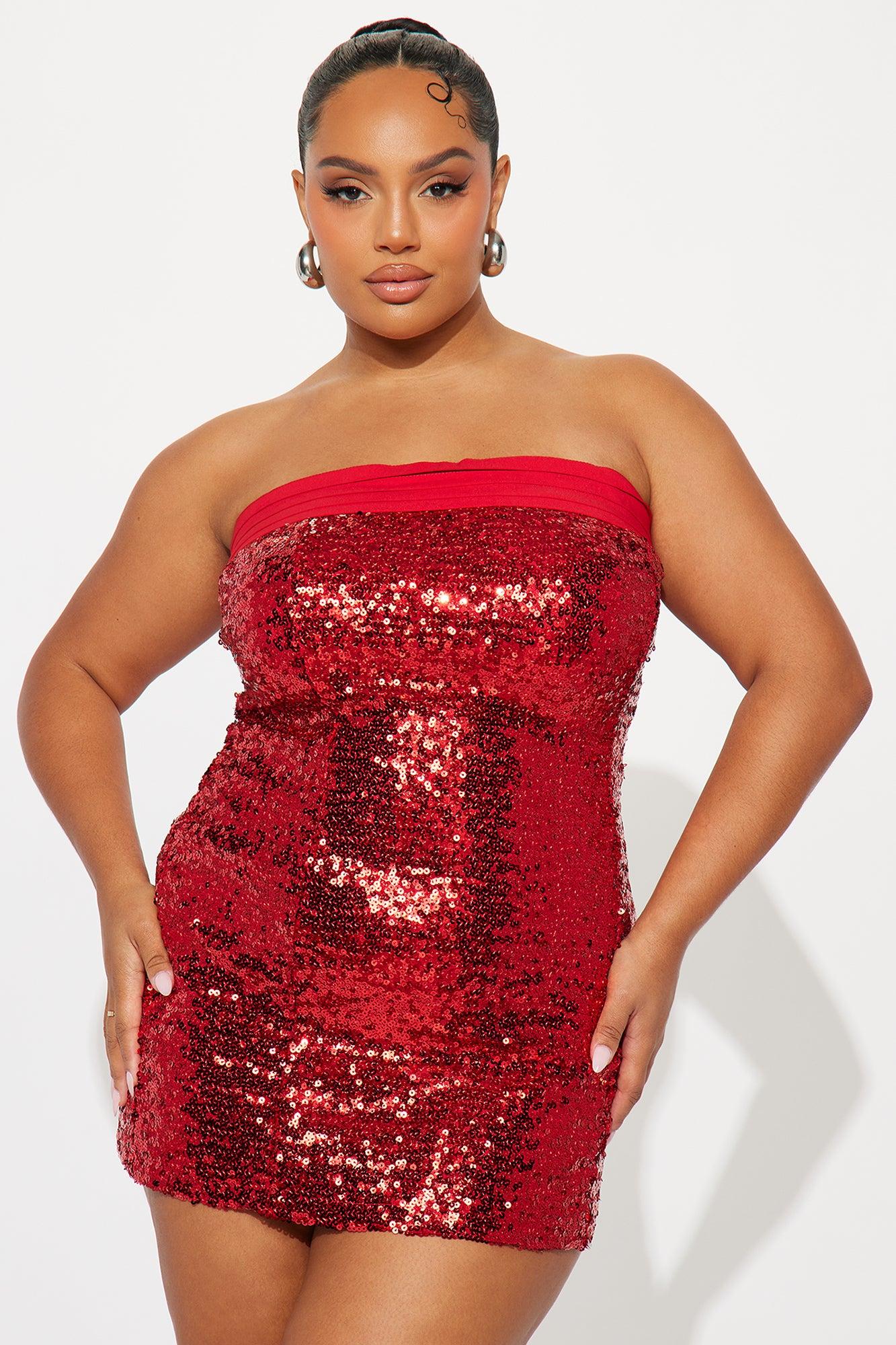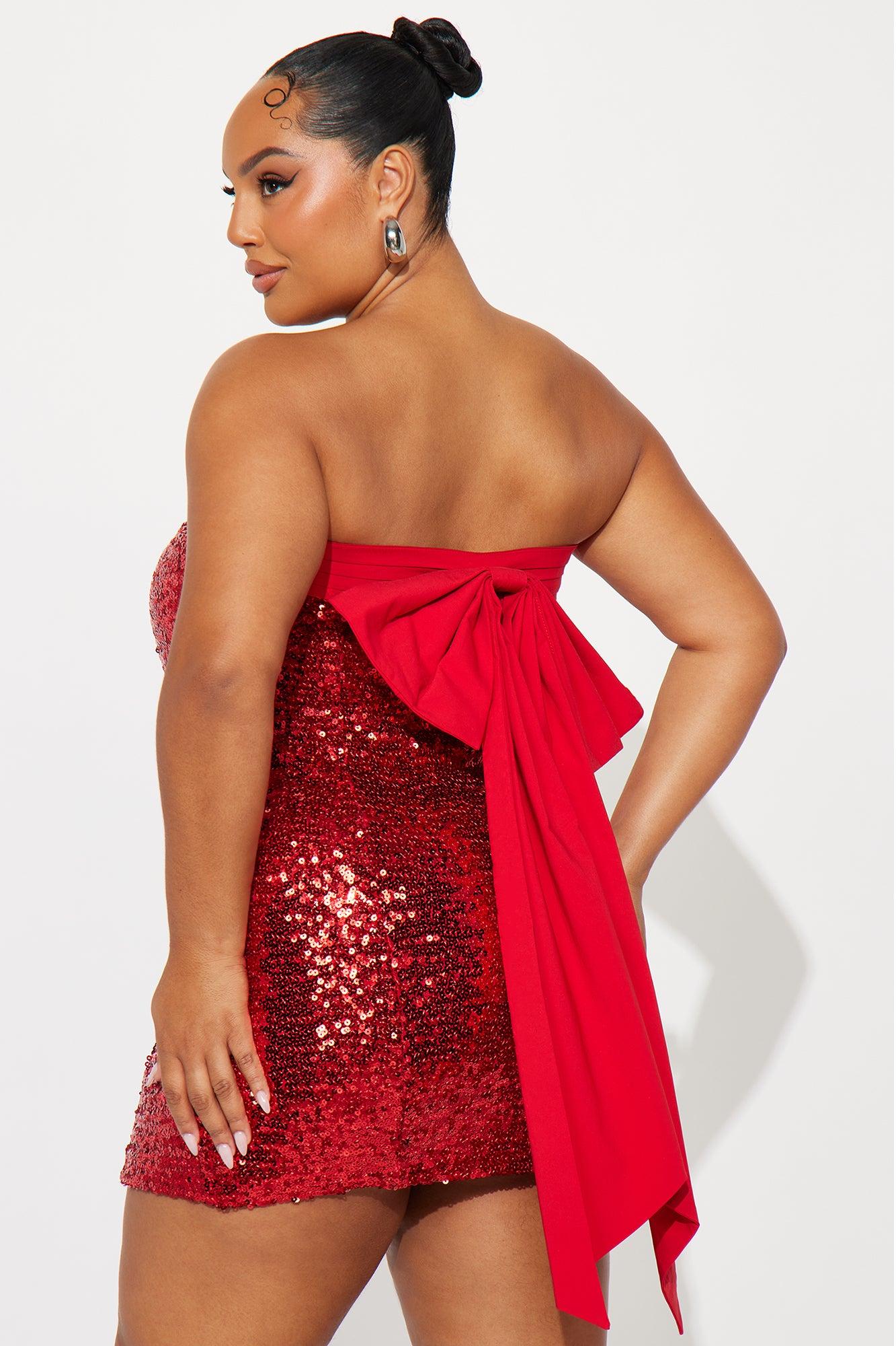 Available In Red. Sequin Mini Dress Straight Neckline Strapless Contrast Trim Back Bow Hidden Side Zipper Lined Non Stretch Length Measured Flat = 24" Self: 95% Polyester 5% Spandex Contrast: 70% Cotton 27% Nylon 3% Spandex Lining: 100% Polyester Imported California Proposition 65WARNING: Cancer and Reproductive Harm - www.P65Warnings.ca.gov.