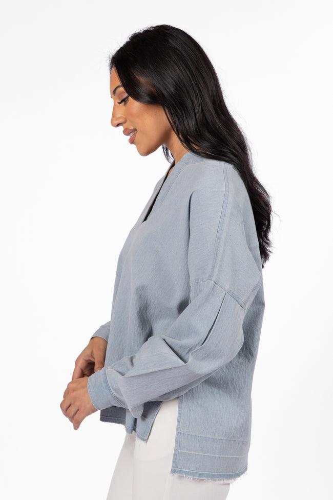 Details Light Wash Chambray Blouse Fabric has some stretch Crew neckline with notch, long sleeves, raw hem, split bottom hem Unlined Size small from shoulder to hem: 20.5" Material and Care 75% cotton 23% polyester 2% elastane Machine wash cold, no drum drying Patterns may vary Materials may have natural variations Colors may vary from different viewing devices.