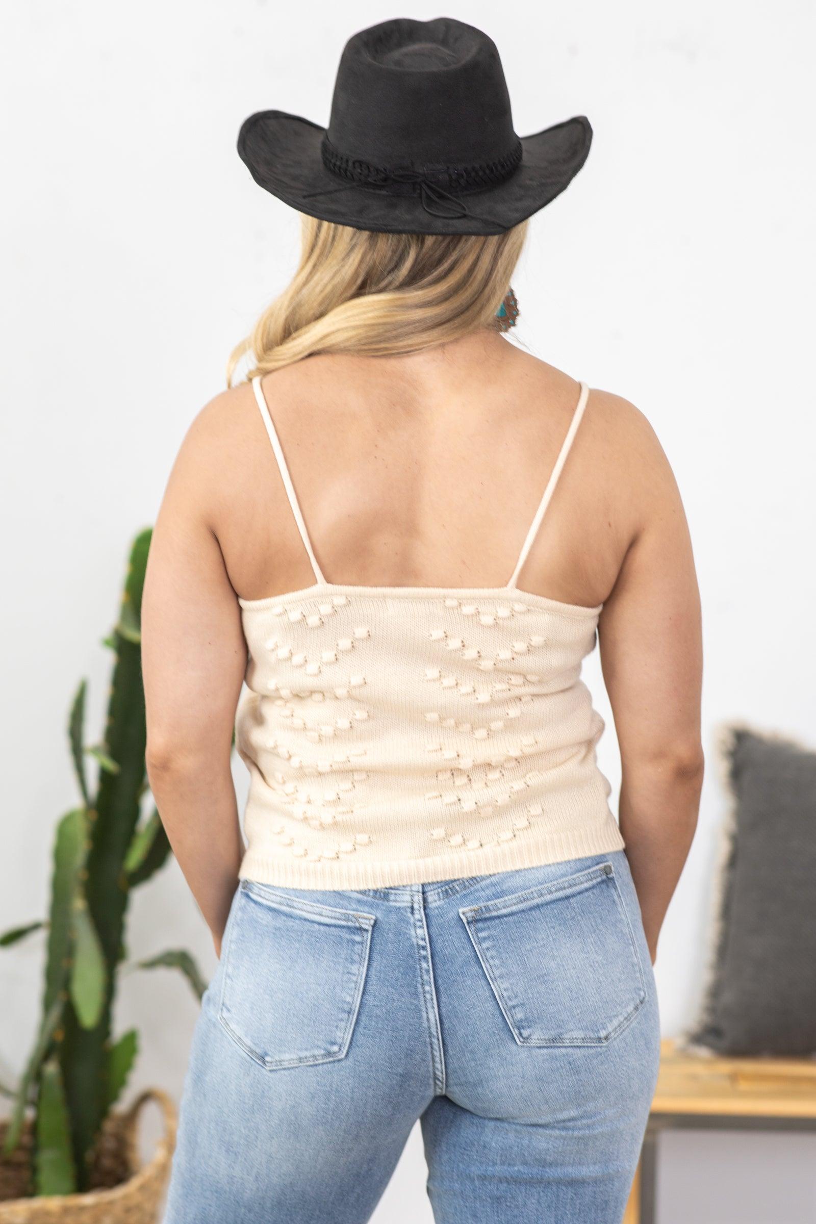Product Details Colors: Beige Print: Solid Dot Neckline: Round Sleeve: Sleeveless Hemline: Straight Brand: Andree By Unit Material and Care 100% Acrylic Hand Wash Cold Hang/Line Dry Size and Fit Small: Bust 34" Waist 32" Length 21.5" Medium: Bust 36" Waist 34" Length 22" Large: Bust 38" Waist 36" Length 22.5" Photo model is 5'7 and wearing a size small