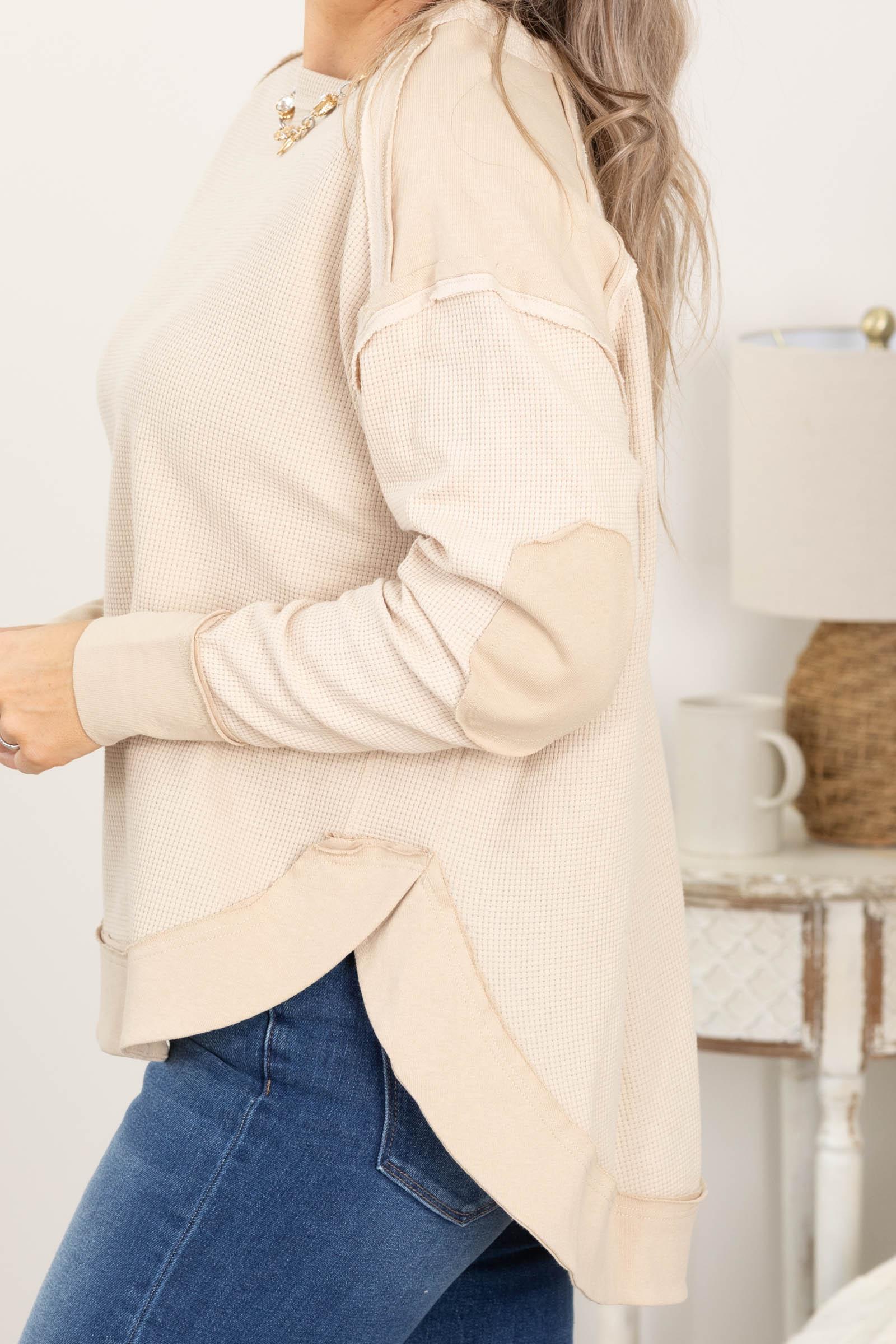 Product Details Colors: Beige Print: Solid Neckline: Round Sleeve: Long Sleeve Hemline: Round Brand: New In Material and Care 1Self: 65% Cotton 35% Polyester Contrast: 100% Cotton Machine Wash Cold Hang/ Line Dry Size and Fit Small: Bust 48" Waist 48" Length "25.5 Medium: Bust 50" Waist 50" Length 26" Large: Bust 52" Waist 52" Length 26.5" Erica is 5’7” and wearing her true size small