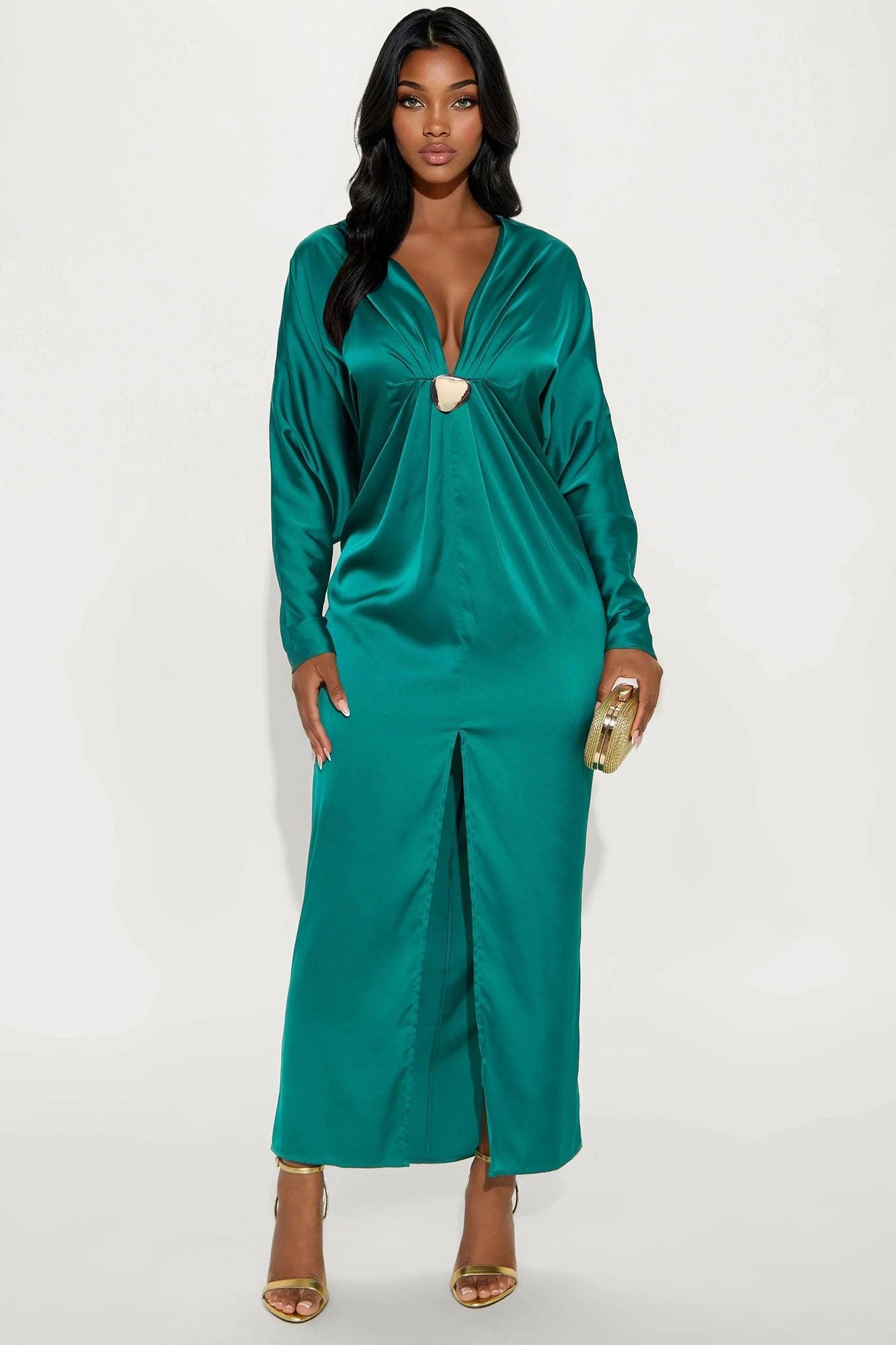 Bejeweled Pleated Satin Maxi Dress - Emerald Female