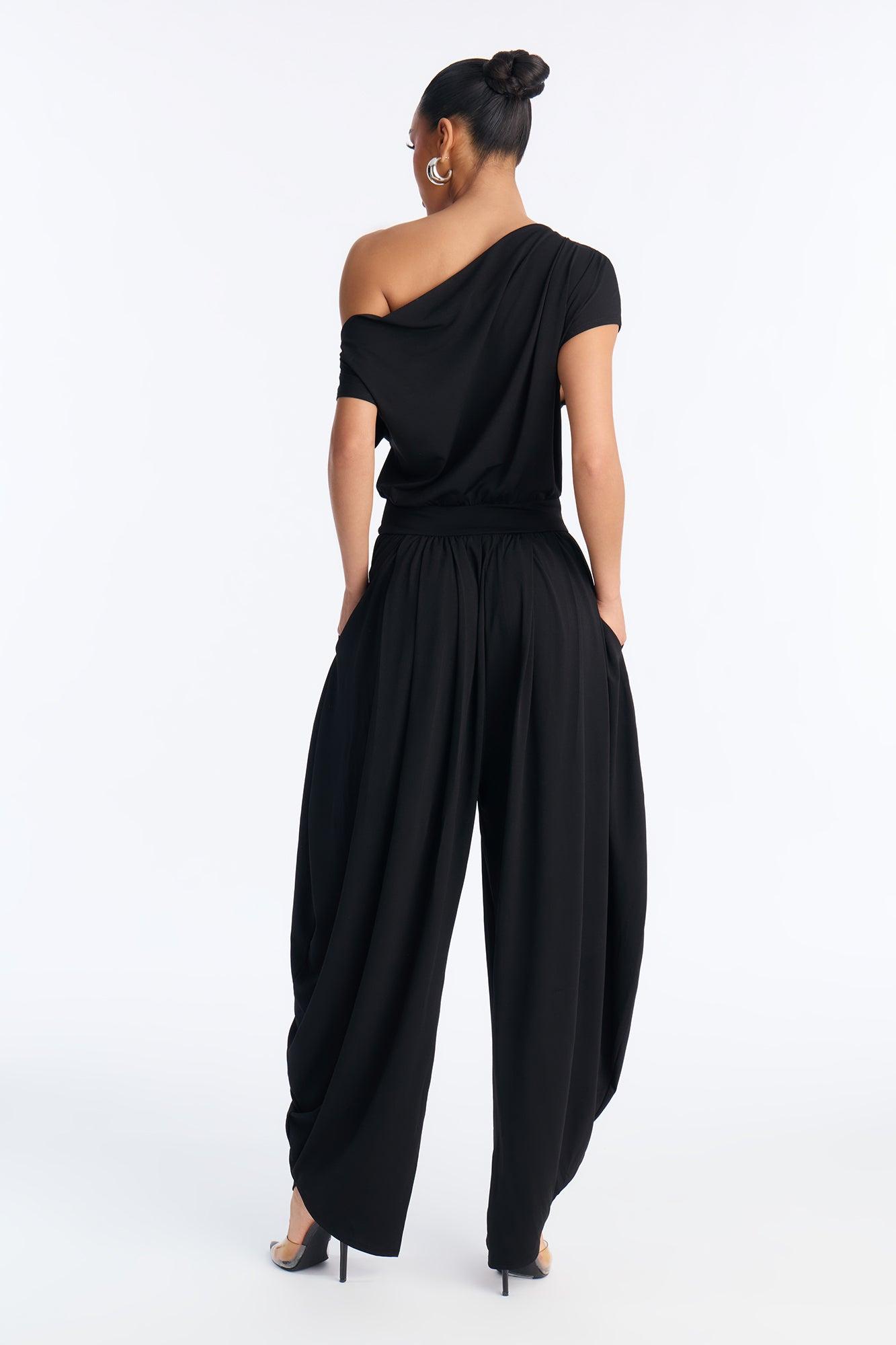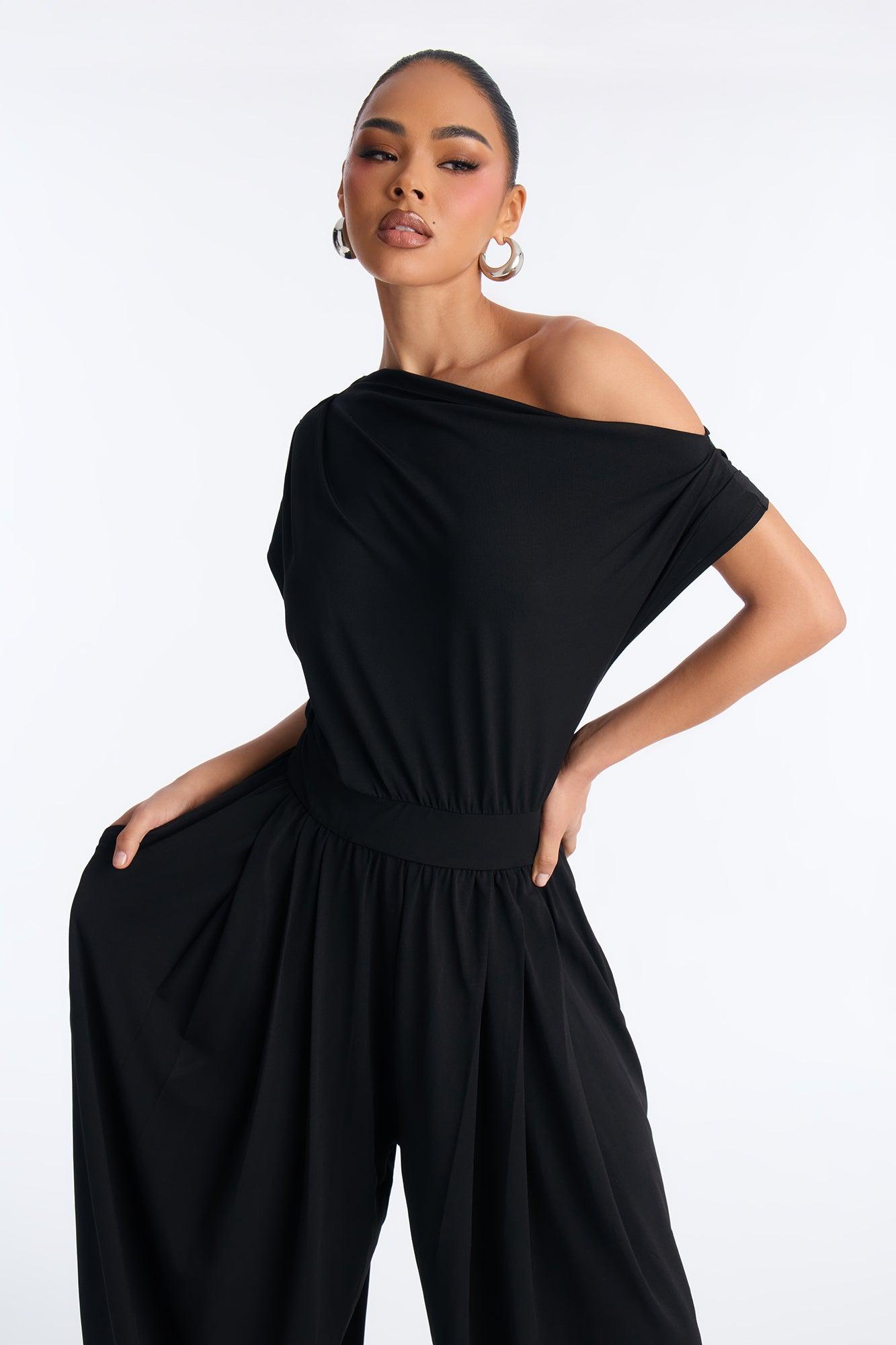 Available In Black, Brown And Slate Blue. Jumpsuit Stretch One Shoulder Neck Elastic Waistband Balloon Wide Leg Pockets 28.5" Inseam Self: 97% Polyester 3%Spandex Imported