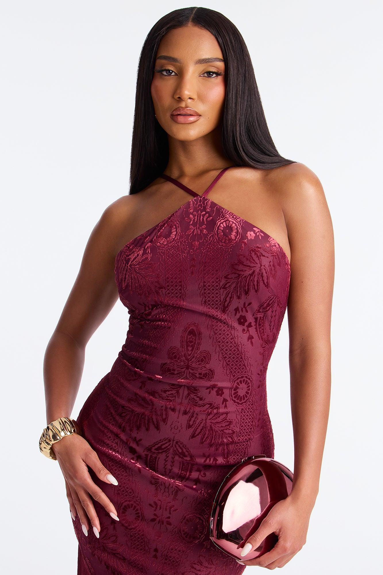 Available In Burgundy. Mesh Flocked Midi Dress V-Neck Adjustable Spaghetti Straps Fringe Trim Back Zipper Closure Stretch Length Measured Flat = 30" Disclaimer: Placement Of Burnout Will Vary. Self: 59% Polyester 30% Nylon 11% Spandex Contrast: 95% Polyester 5% Spandex Lining: 100% Polyester Imported