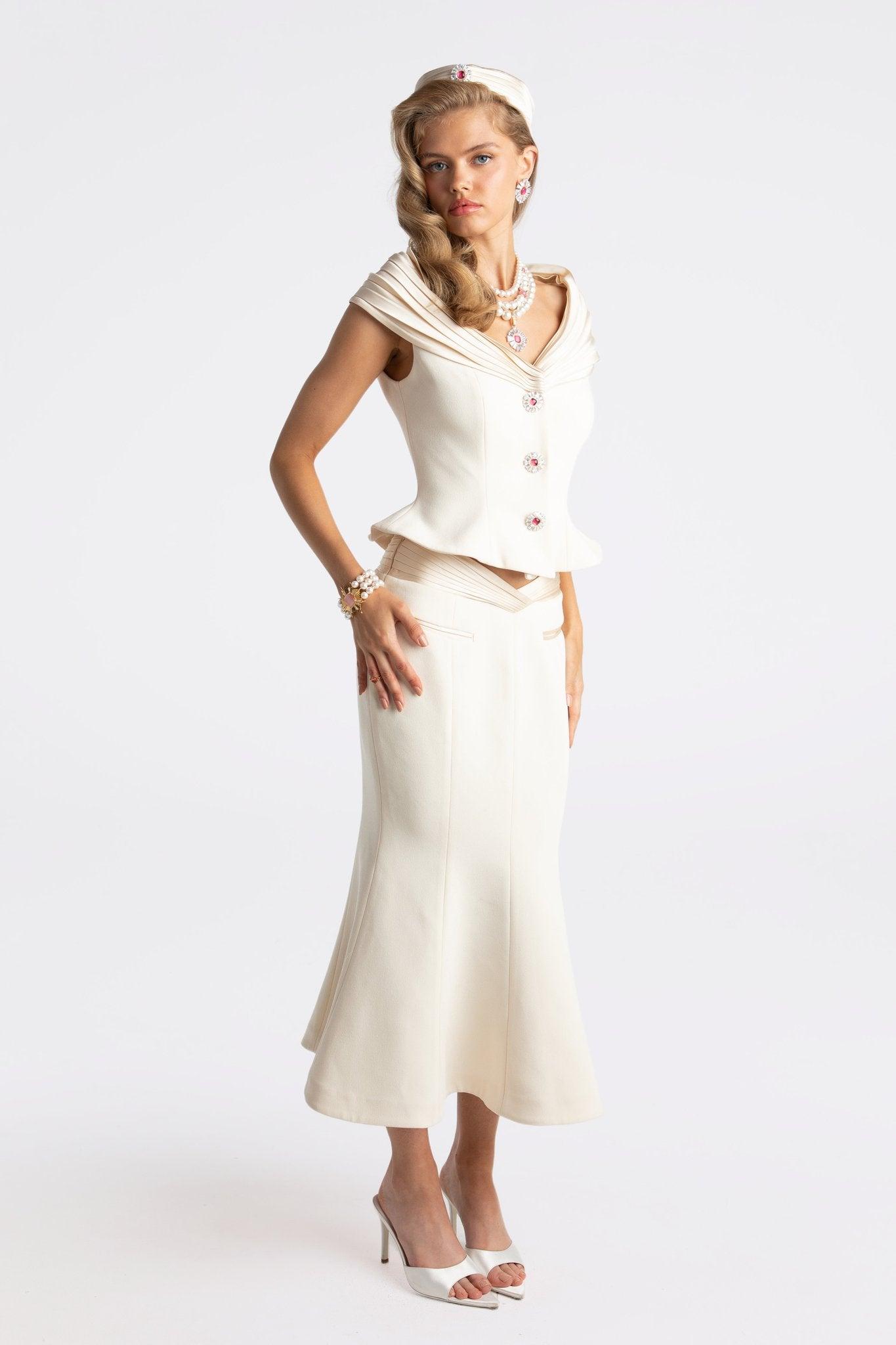 Fall head over heels for this stunning little mermaid skirt. The Belle Satin Skirt is delicately made to accentuate your figure by featuring a fishtail design that moves with you. The stunning colors and perfect fit make it a must-have in your wardrobe. Pair it with the Belle Satin Top for a jaw-dropping look. Powder and purple fabric Waist stain fabric Fishtail design Dry clean only