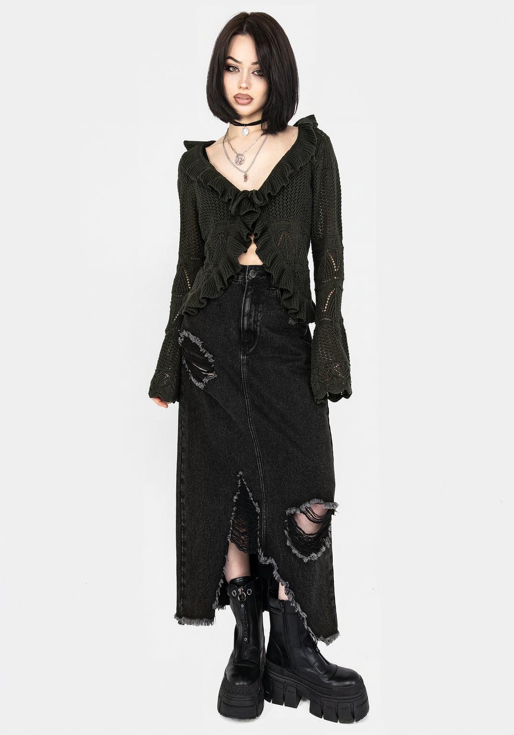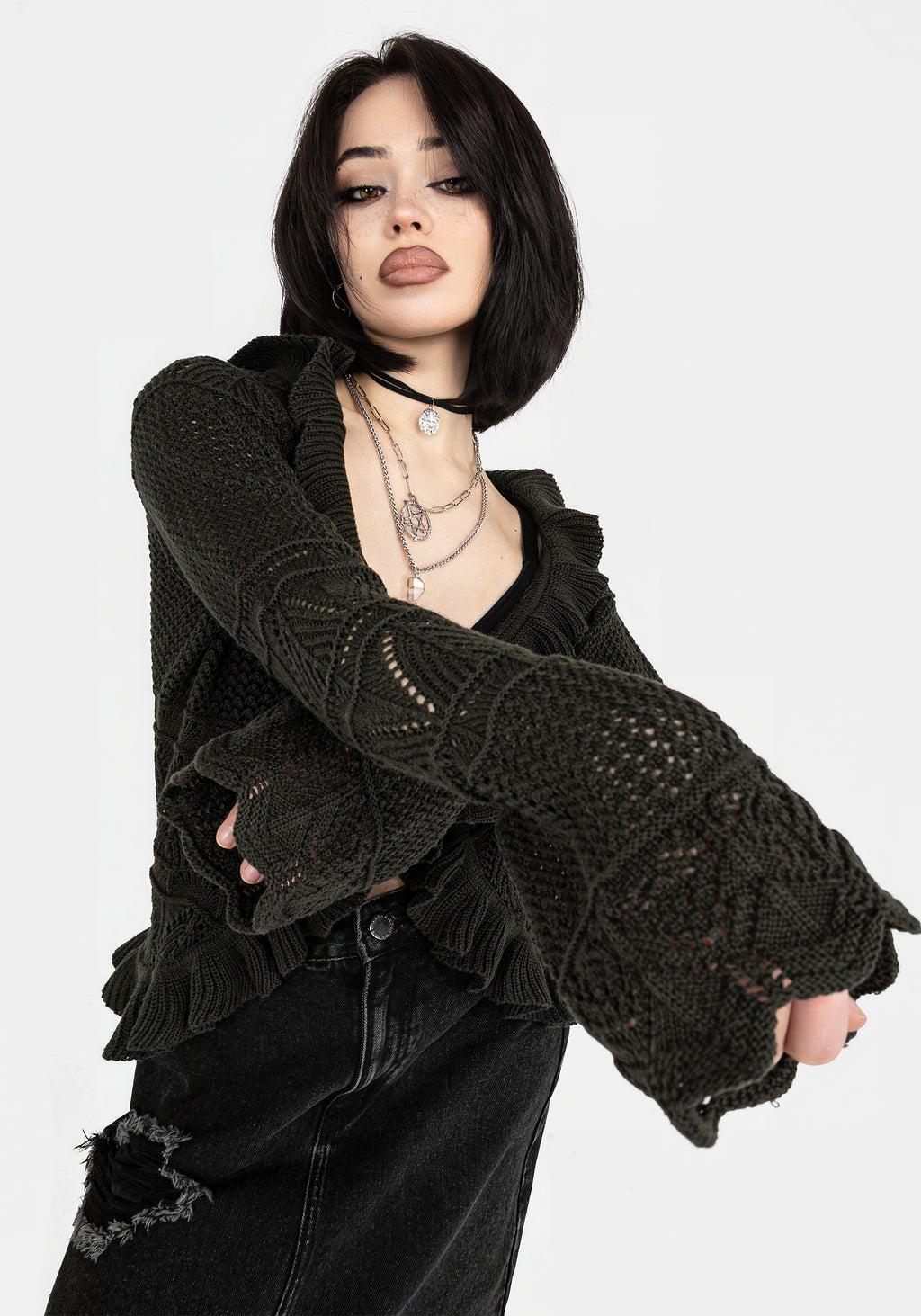 A knit with the IT FACTOR - Green pointelle knit ruffle crop cardigan - Cosy relaxed fit ends a little below the natural waist at the back - Front self-fabric tie fastens at the bust to create a V-neckline & dipped hem - Ruffles like opening to add volume - Long sleeves with flared cuffs to add drama - Geometric pointelle knit pattern in a grungy dark green yarn - Breathable cotton-blend fabrication - Sling on over earthy prints on cool evenings after warm days 55% acrylic, 45% cottonChristina is 5'3" and wearing a UK6 / US2