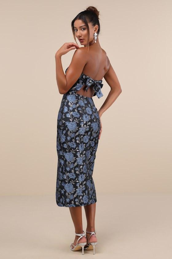 The Lulus Beloved Belle Black Multi Jacquard Strapless Bow Midi Dress is a luxe look everyone will instantly love! Sturdy woven jacquard, with an embossed blue and silver floral pattern and shiny Lurex threading throughout, shapes a sweetheart neckline (with hidden no-slip strips) and a strapless bodice with supportive side boning. High, fitted waist sits atop a figure-skimming bodycon skirt that finishes at a midi hem with a flirty side slit. Turn around to reveal a cute tying bow detail that secures above a head-turning cutout at the back. Elastic at back and hidden back zipper/clasp.