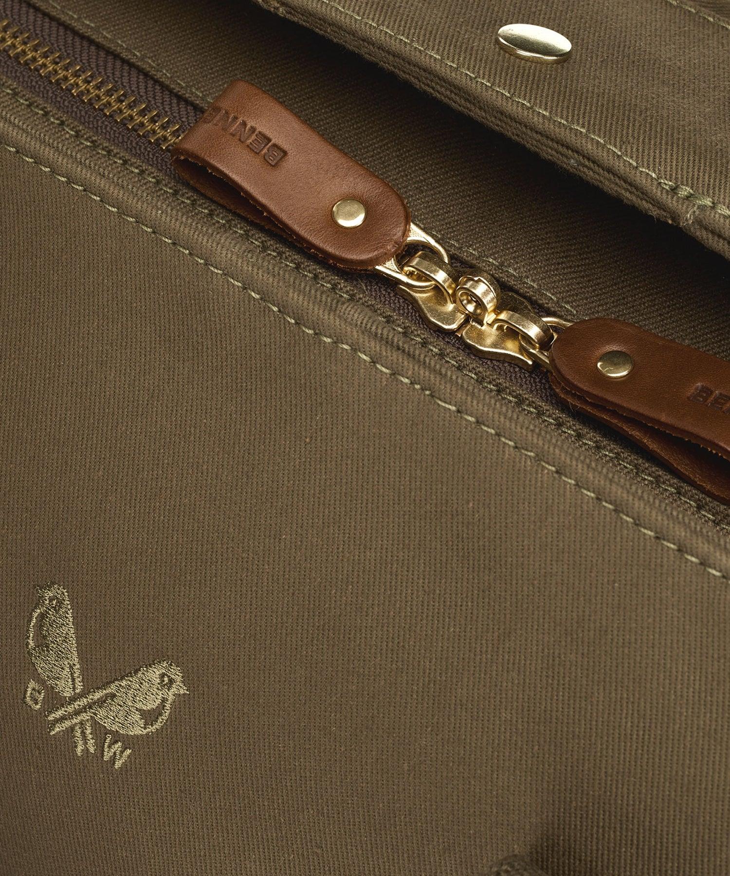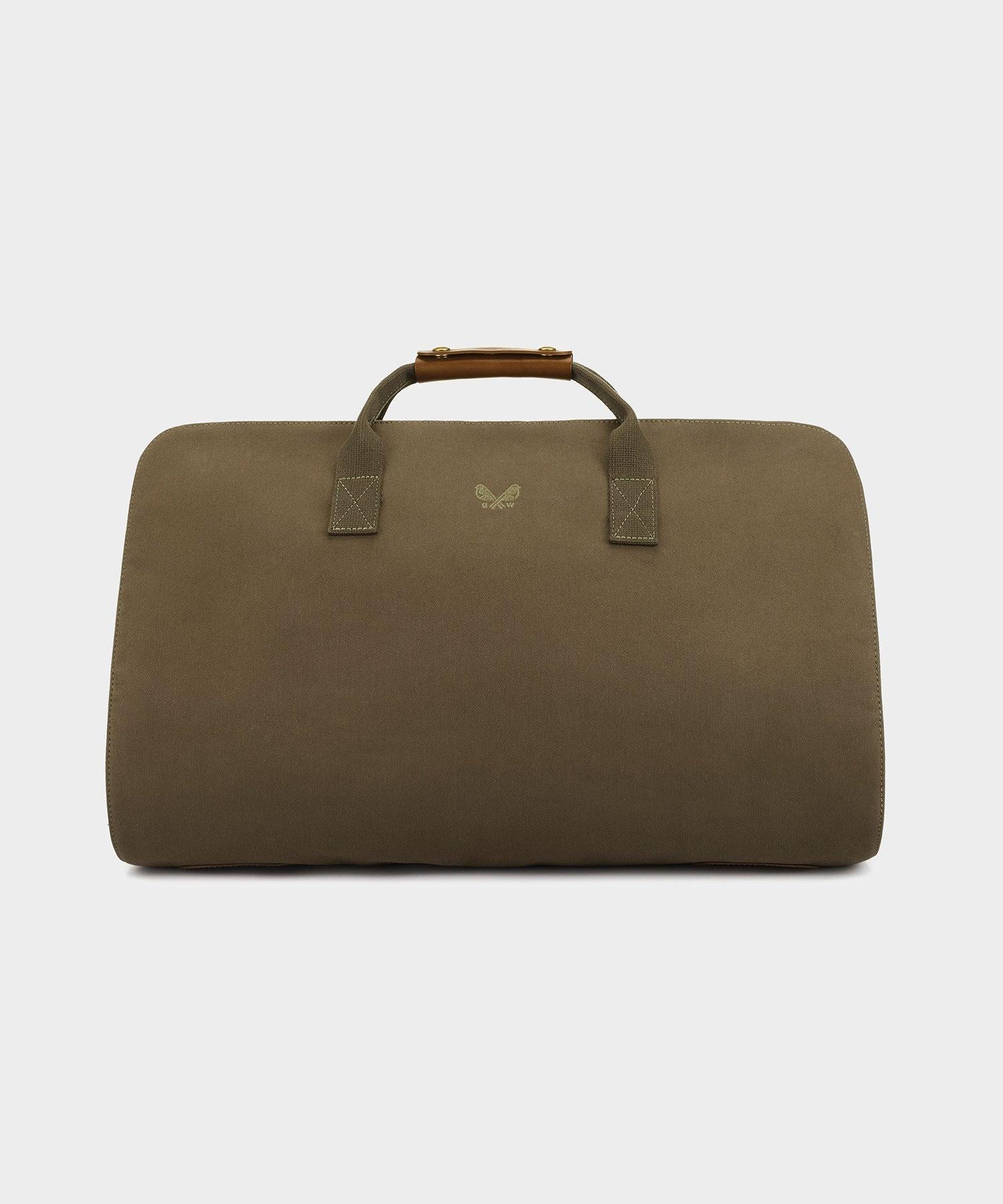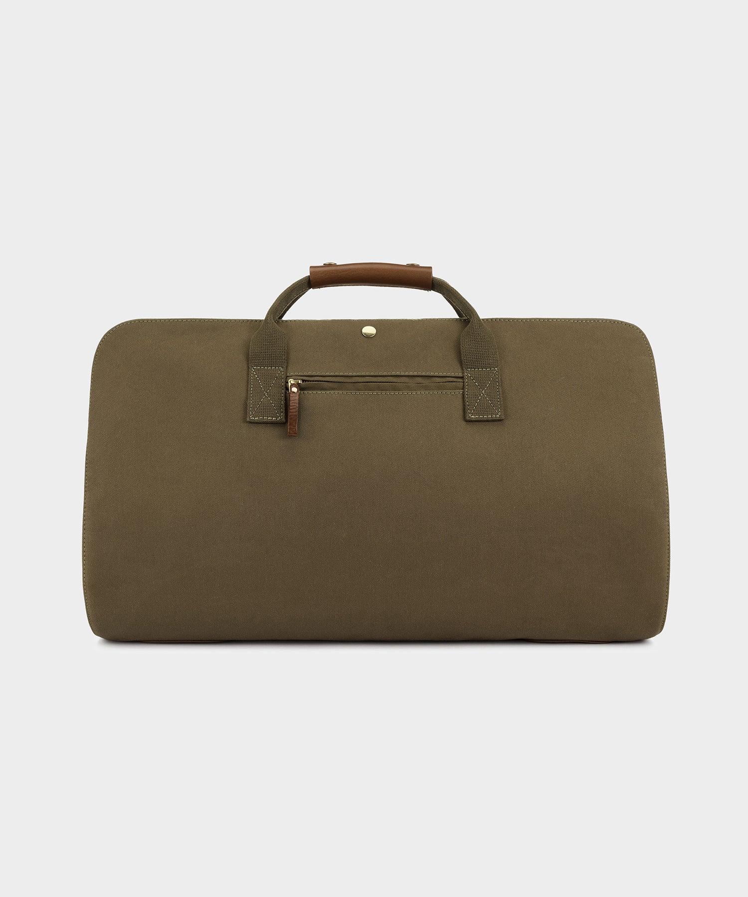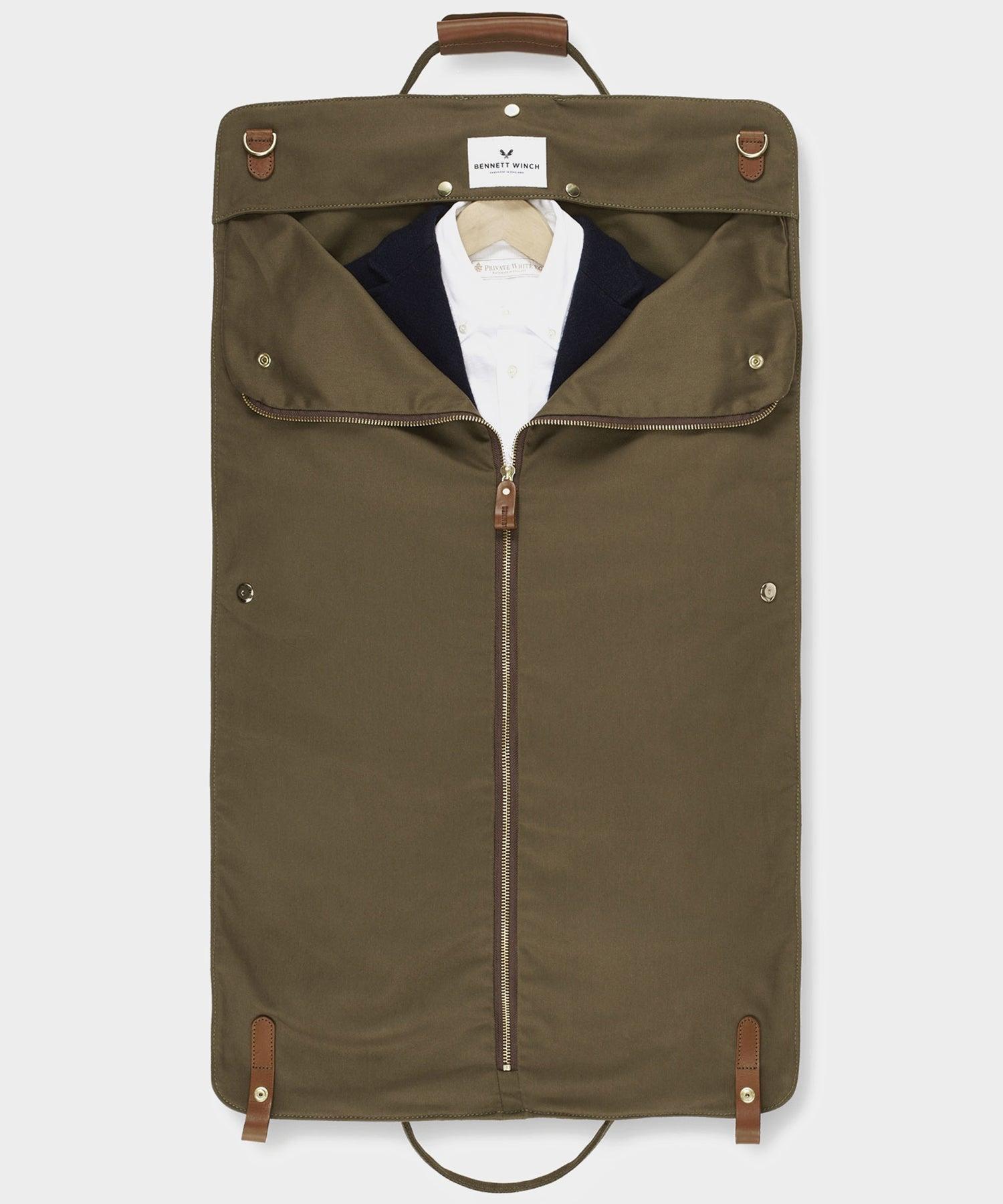 A refined essential for the modern traveler, the Olive S.C. Holdall combines a suit carrier and holdall in one. Its innovative 2-piece design wraps your jacket and trousers around a spacious bag, secured with magnetic clip points and straps, preventing sharp folds. Each component can be used separately, offering flexibility and style on the move. Features include an external pocket for passport, keys, or wallet, a removable waterproof shoe bag, a slimline coat hanger, and ATA carry-on compliance for most premium airlines. Exterior waterproof cotton canvas, solid brass hardware, veg-tanned Italian leather, YKK golden brass zips 22.6" L x 14.1" W x 17.7" H Made in England Stye SCH