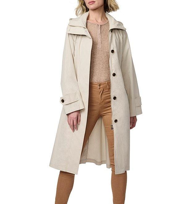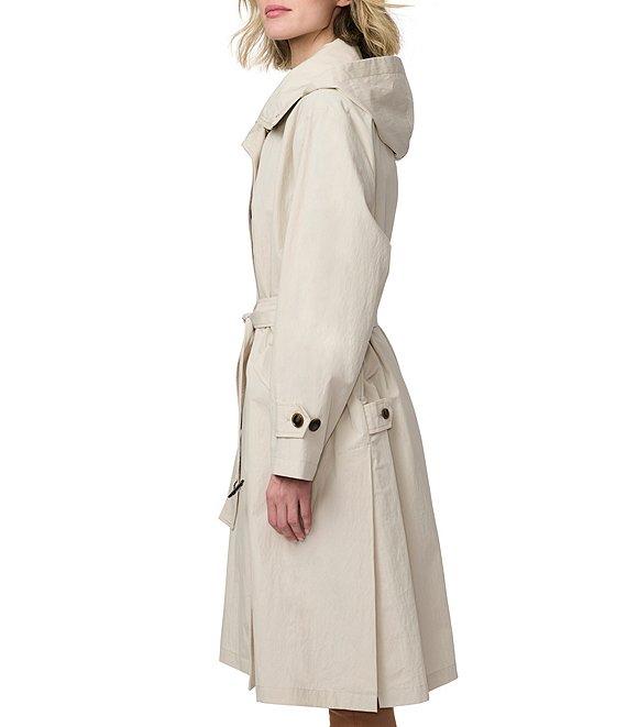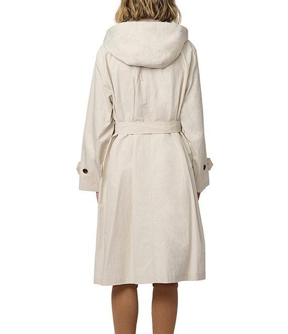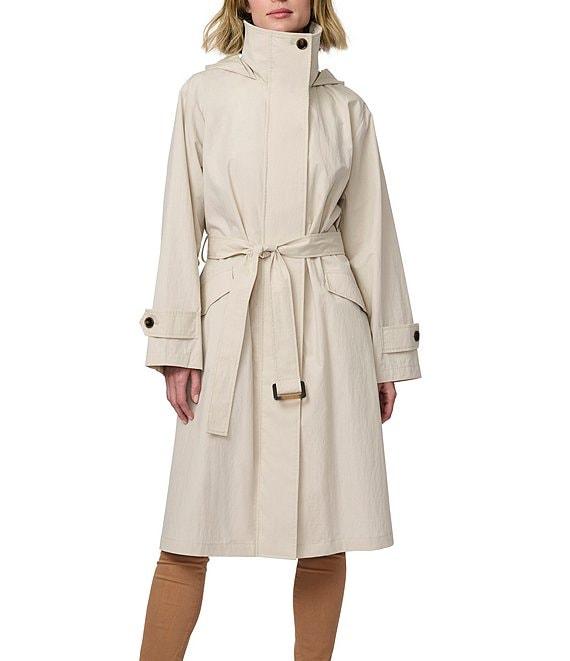 From Bernardo, this jacket features: Crinkle fabrication Oversize silhouette Stand collar neckline Long flare sleeve Two welt pockets under flap Self tie belt Relaxed fit Packable hood into collar Water repellent Light weight Straight hemline Hidden button/zip front closure Approx. 42.5" length Cotton/nylon Machine wash/cold Imported.