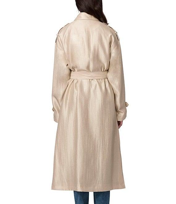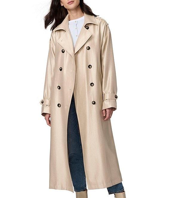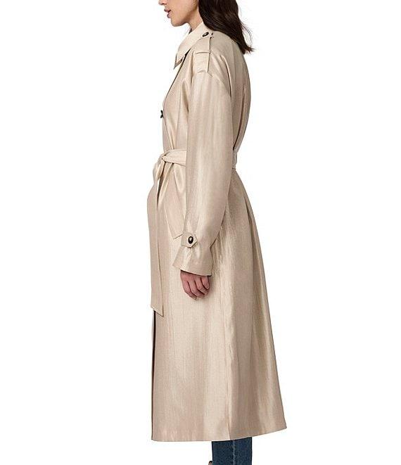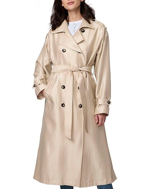 From Bernardo, this jacket features: Satin shimmer texture fabrication Double breasted silhouette Point collar neckline Long sleeves with adjustable cuffs Shoulder epaulettes Two welt pockets Self tie belt Semi-fitted Water repellent Light weight Fully lined Straight hemline Double button closure Approx. 49" length Rayon/polyester/nylon; lining: polyester Machine wash Imported.