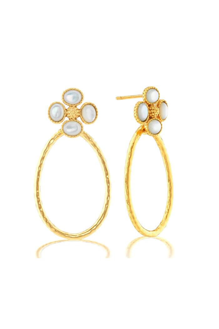 Teardrop hoops of shimmering hammered gold dangle from clover-shaped studs of luminous mother of pearl with intricately detailed golden accents and gilded berry centers. With understated elegance, this irresistible pair of earrings knows precisely how to make a subtle statement, whether it’s a day at the office or a night out on the town. Lucky you!