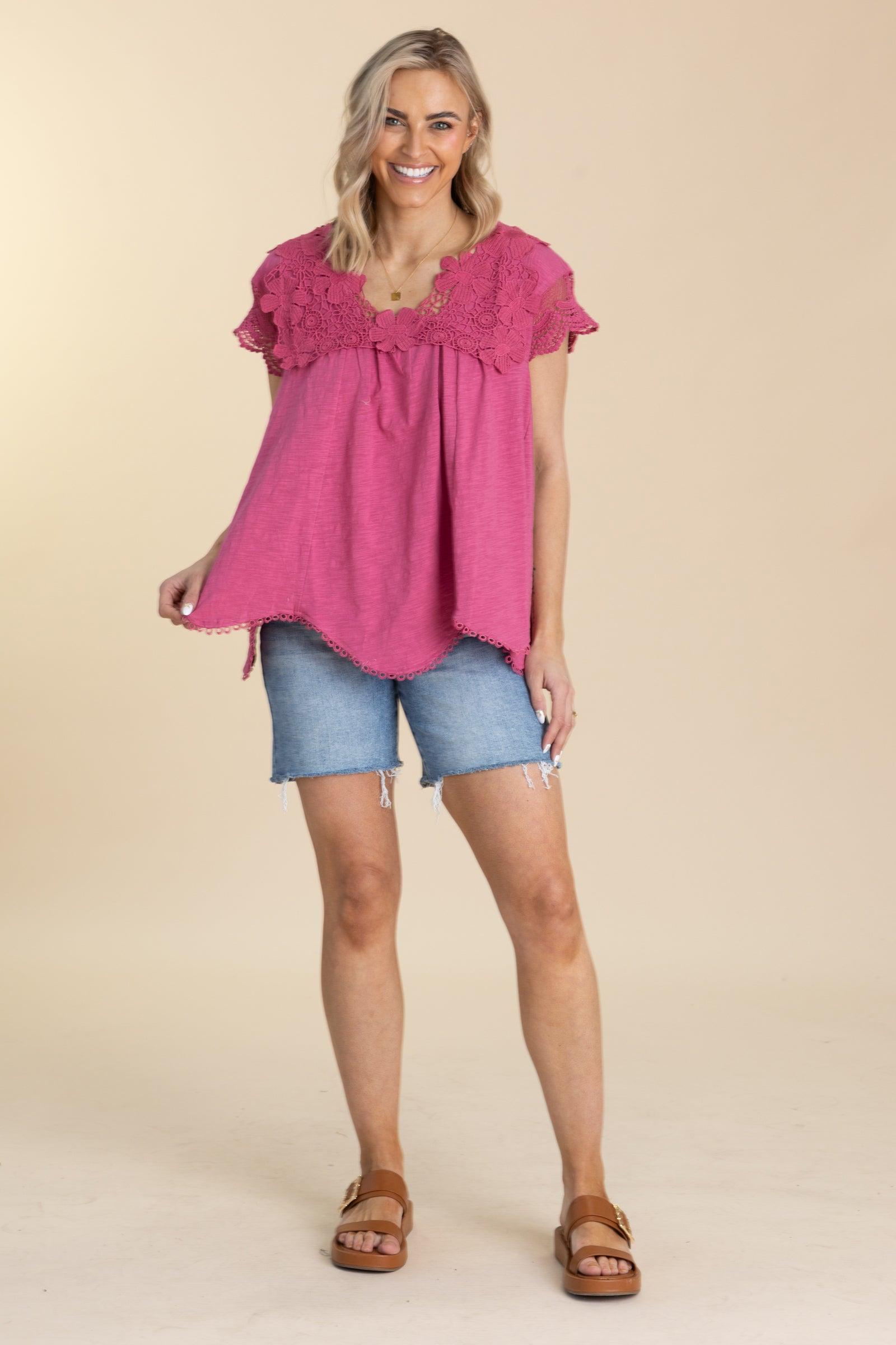 Product Details Colors: Berry Print: Solid Neckline: V-Neck Sleeve: Short Sleeve Hemline: Scalloped Brand: Easel Material and Care 100% Cotton Hand Wash Cold Hang/Line Dry Size and Fit Small: Bust 44" Waist 48" Length 25" Medium: Bust 46" Waist 50" Length 25.5" Large: Bust 48" Waist 52" Length 26" Model is 5’8” and wearing a size small