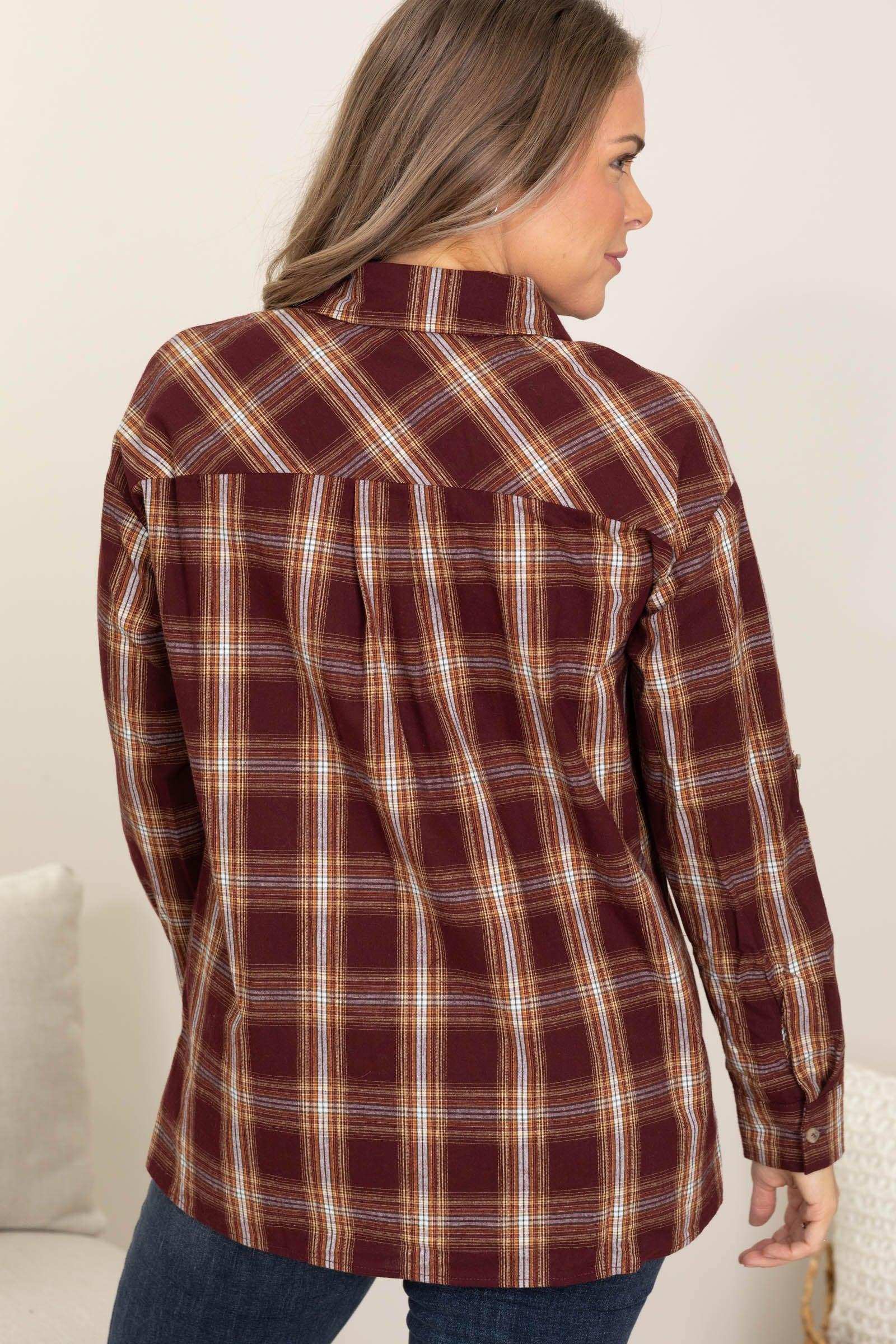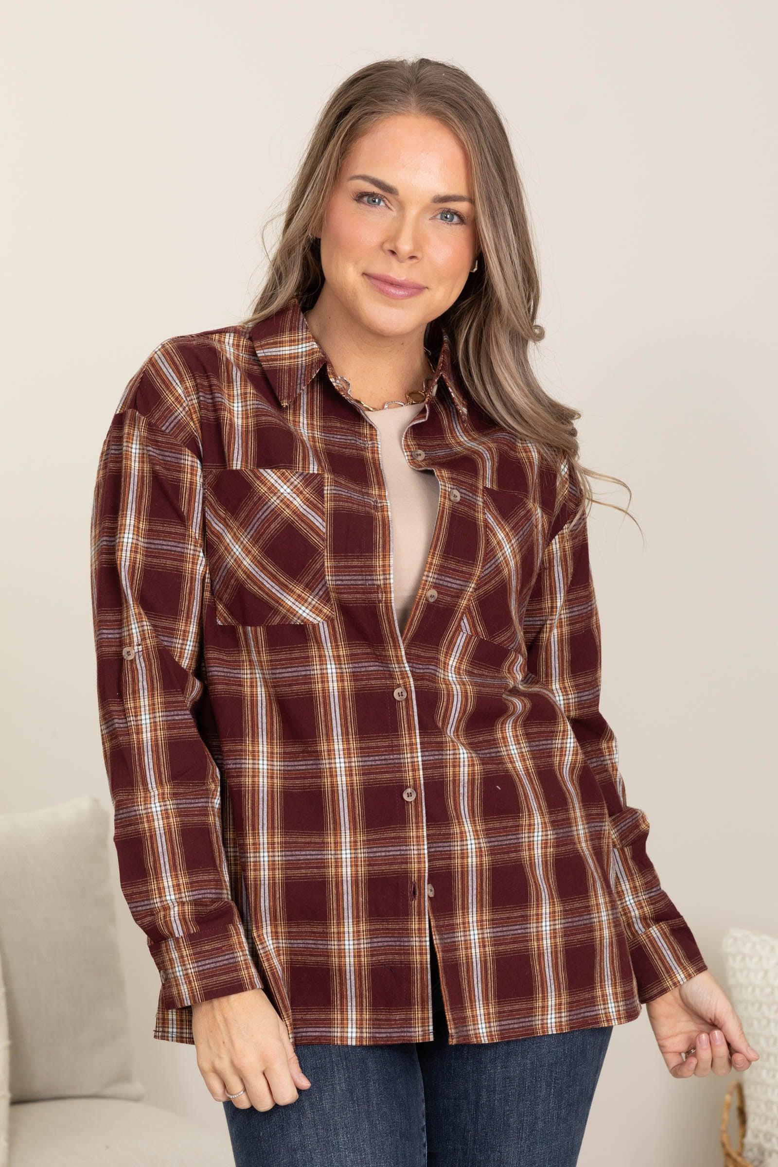 Product Details Colors: Berry, Hunter Green, Orange, White, Tan Print: Plaid Neckline: Button Down Sleeve: Long Sleeve Hemline: Round Brand: Doe & Rae Material and Care 100% Cotton Hand Wash Cold Hang/ Line Dry Size and Fit Small: Bust 42" Waist 42" Length 28" Medium: Bust 44" Waist 44" Length 28.5" Large: Bust 46" Waist 46" Length 29" Erica is 5’7” and wearing her true size small
