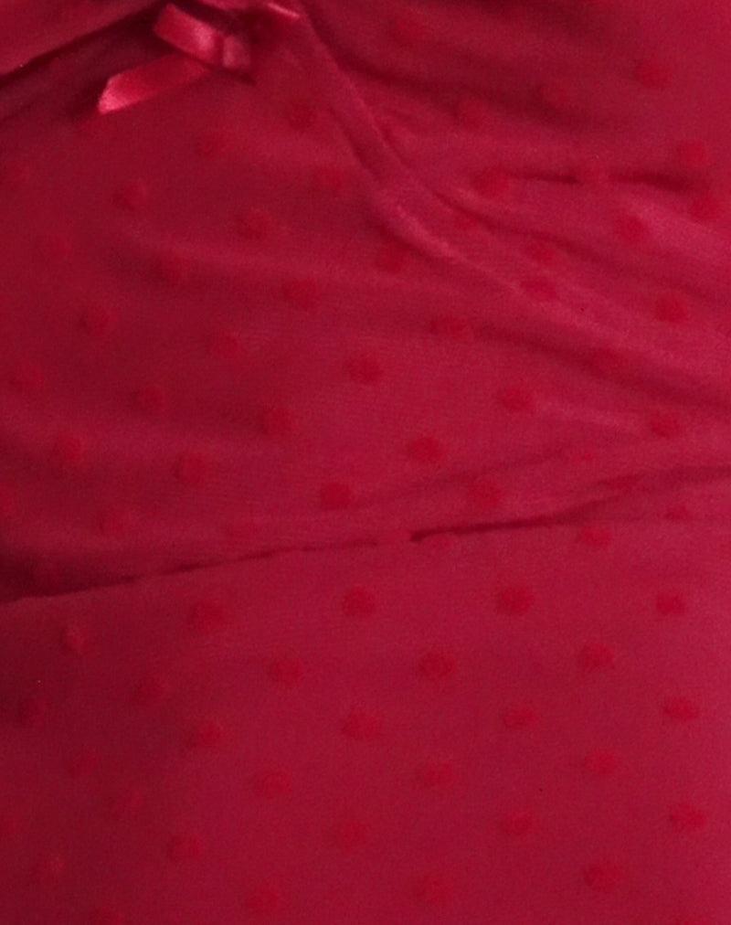 The Bestari dress, features a sweetheart neckline with underbust detailing, mini length and a double layered ruffle hem. Finished with a small ruffle strap and neckline detail and a small centre front bow on the chest, in a basic polka cherry print fabric. MODEL WEARS SIZE: EXTRA SMALL - MODEL HEIGHT:5'7