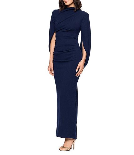 From Betsy & Adam, this dress features: Scuba crepe fabrication Sheath silhouette High neck Cape back sleeves Ruching Zip back closure Approx. 60" length Polyester Dry clean Imported.
