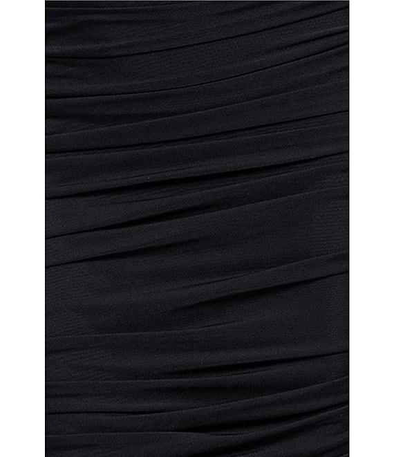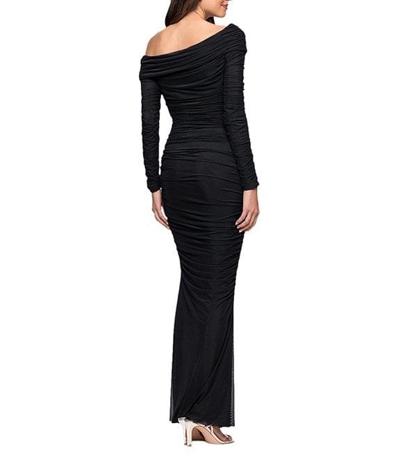 Betsy & Adam One Shoulder Long Sleeve Mesh Gown