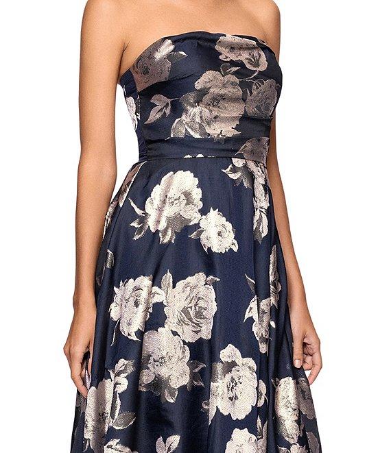 From Betsy & Adam Petite, this dress features: Burnout jacquard fabrication Strapless neckline Sleeveless Floral print Lined Ball gown silhouette Center back zipper closure Polyester Imported.