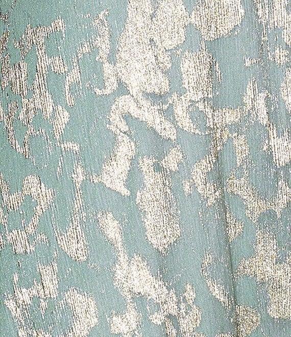 From Betsy & Adam Plus, this gown features: Metallic foil knit fabrication V-neckline Long sleeves A-line silhouette Lined Pockets Foil print Back zip closure Approx. 63" in length from high point shoulder Polyester/spandex Spot clean Imported.